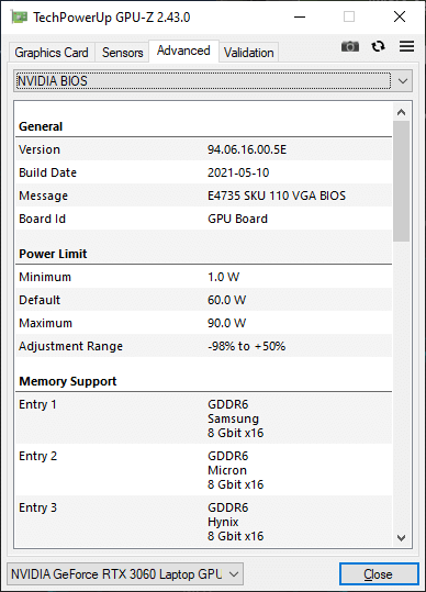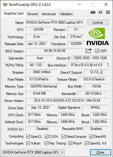 Процессор имеет встроенную графику Intel Iris Xe, особенности которой мы разбирали ранее. Она используется при низкой нагрузке в 2D-режиме. За обработку графику в 3D отвечает видеокарта NVIDIA GeForce RTX 3060. Мобильная версия базируется на GPU106 с 3840 потоковыми ядрам CUDA против 3584 ядер CUDA у десктопной GeForce RTX 3060. При этом мобильная видеокарта работает на низких частотах с сильно урезанным TDP. В данном случае перед нами экономичная версия Max-Q. Заявлена мощность 60 Вт с максимальным значением до 90 Вт. Базовая частота GPU 817 МГц при Boost Clock 1282 МГц. Память GDDR6 работает на 192-битной шине при частоте 11740 МГц, объем памяти — шесть гигабайт.