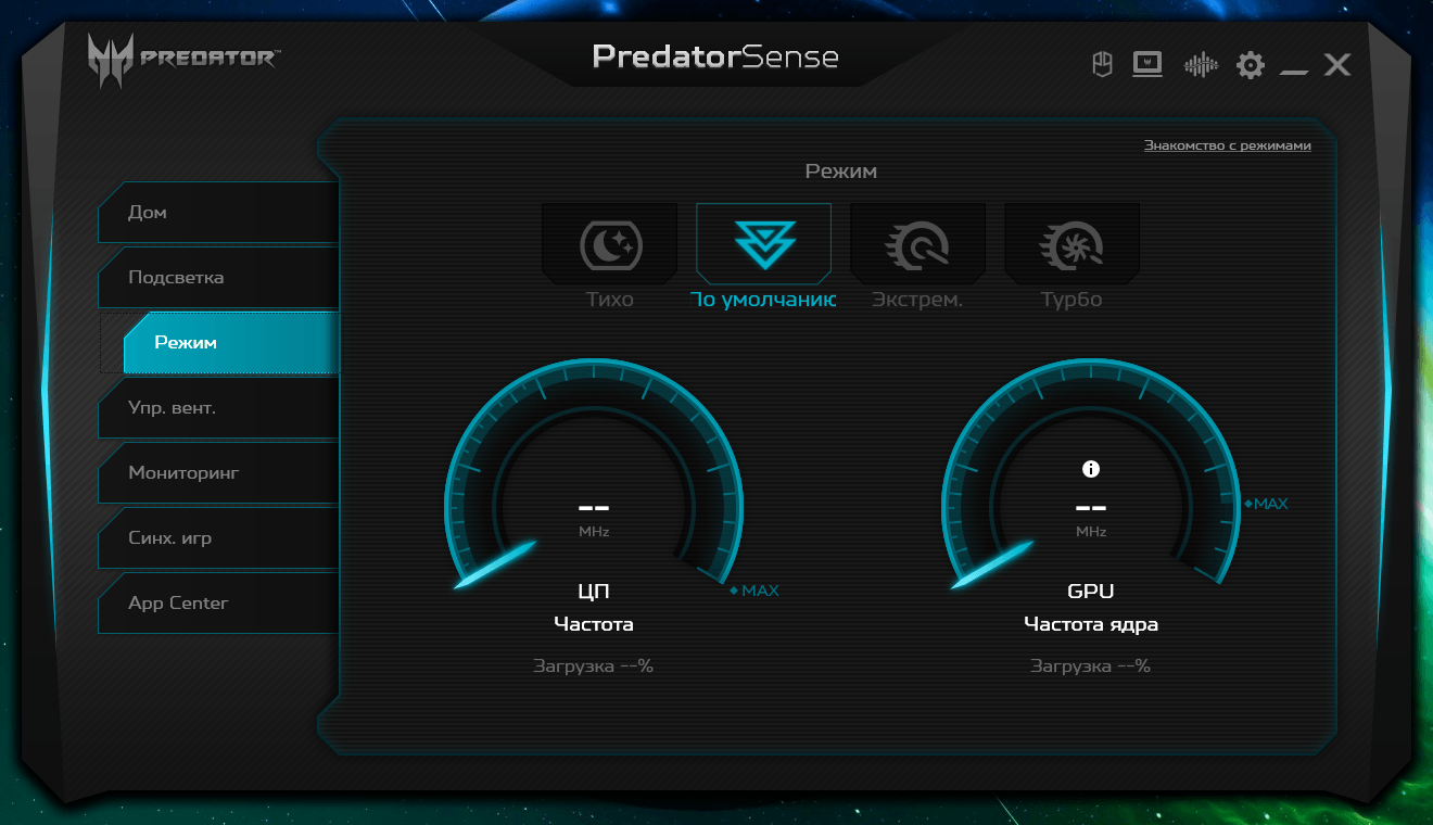 Кроме стандартного режима «По умолчанию» предусмотрены тихий, экстремальный и Турбо-режим. Тихий снижает скорость вентиляторов с понижением максимальной производительности. Экстремальный режим предусматривает «разгон» за счет небольшого увеличения лимитов мощности и ускорения рабочих алгоритмов вентиляторов. Турбо-режим переключает вентиляторы на максимальную скорость для максимальной производительности системы, быстрое включение возможно через отдельную клавишу на клавиатуре. Также предусмотрена возможность отдельной регулировки скорости вентиляторов и подробный мониторинг температур с графиками.