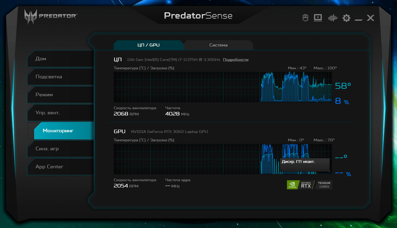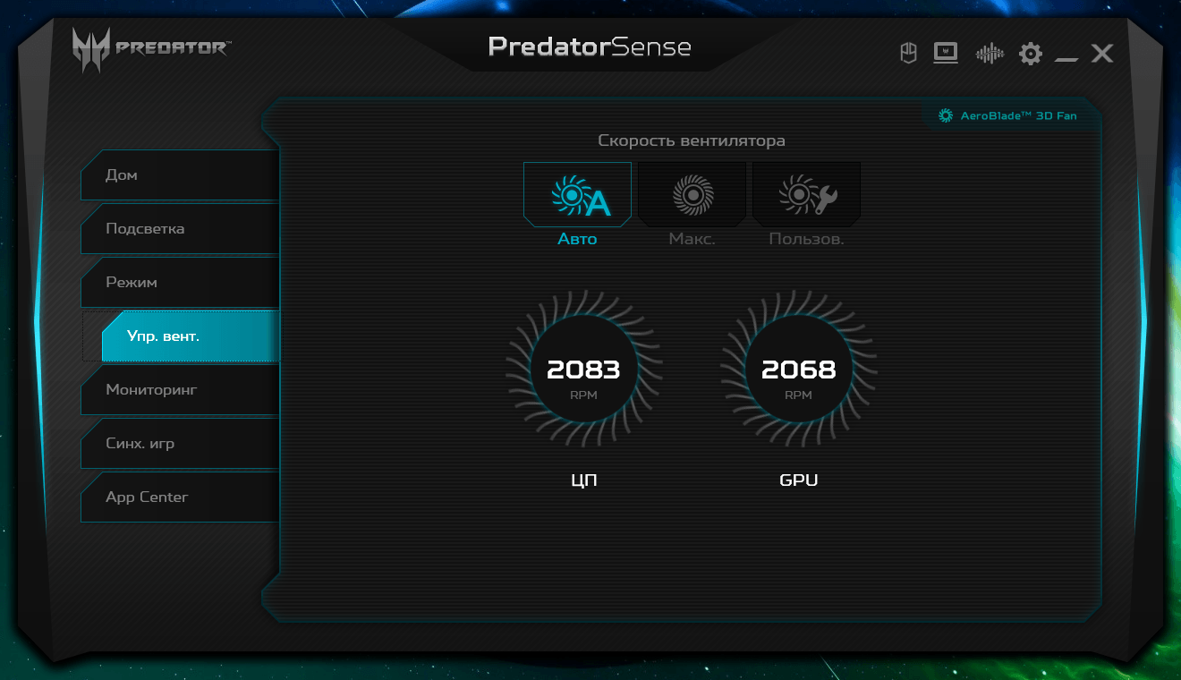 У Acer нет плавной регулировки рабочих алгоритмов вентиляторов. Настройки в Acer PredatorSense предусматривают фиксированную скорость. Но при начальной скорости около 4300 об/мин в пиковые моменты мониторинг показывал до 5000 об/мин. Режим «Турбо» предусматривает 5900 об/мин, что уже слишком громко.