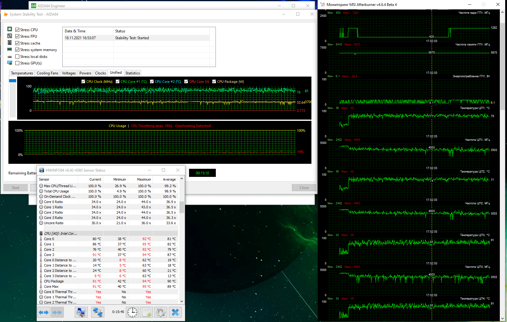 В таком режиме температура GPU достигала 75 °С при частотах Boost около 1500 МГц. Процессор Intel Core i7-11375H прогревался до пиковых значений около 90 °С, хотя средние рабочие температуры были ближе к 70–80 °С. Ядра показывали разгон выше 4 ГГц, пиковые значения до 4,7 ГГц. Максимальная скорость процессорного вентилятора не превышала 3900 об/мин, вентилятор GPU раскручивался до 4100 об/мин.