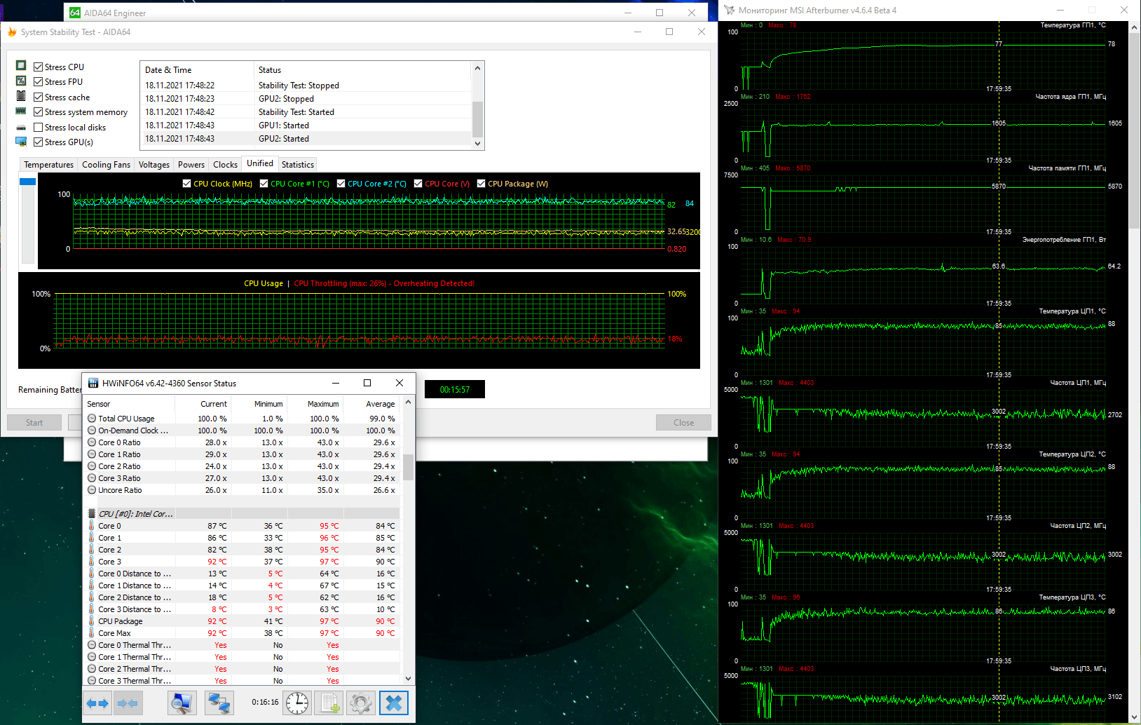 В первом тесте температура ядер процессора достигала 80–90 °С (до 95 °С в пике). Ядра показывали буст до 4 ГГц и выше, но средние частоты около 3,5 ГГц. При экстремальной нагрузке на все компоненты возрастает нагрев процессора, что привело к снижению частоты ядер до 3 ГГц. Графический чип прогревался до 78 °С при частотах около 1600 МГц. Скорость вентиляторов в самом жестком температурном режиме была на уровне 4000 об/мин.