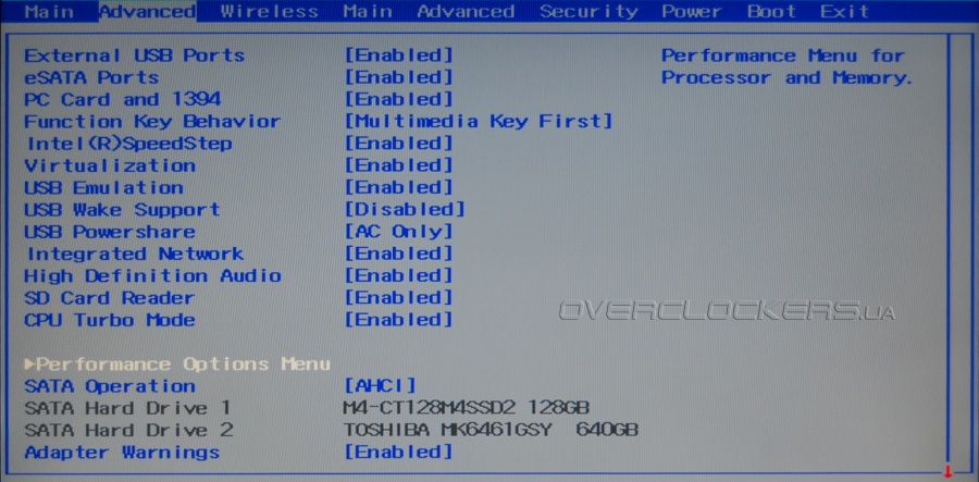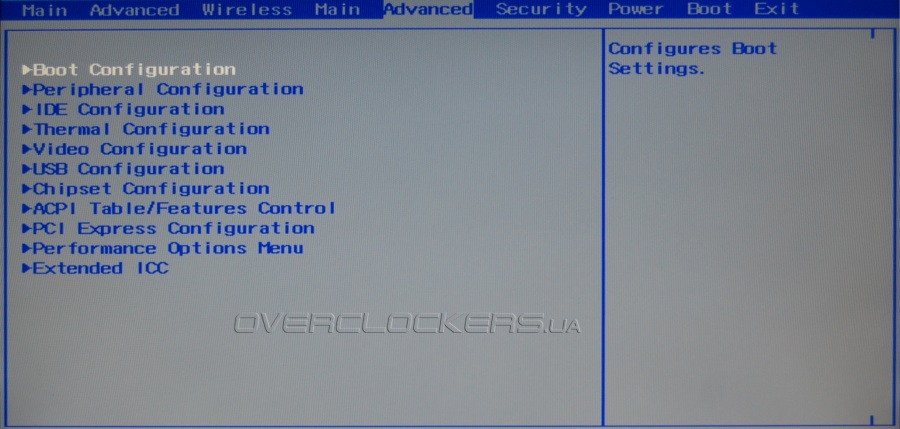 Расположение параметров в меню BIOS вполне традиционно, хотя некоторые основные разделы дублируются. Настройки в них дополняют друг друга. Параметры загрузки, настройки контроллеров и портов, беспроводной сети, интегрированного видео — возможности BIOS в целом стандартны, но количество доступных параметром очень велико.