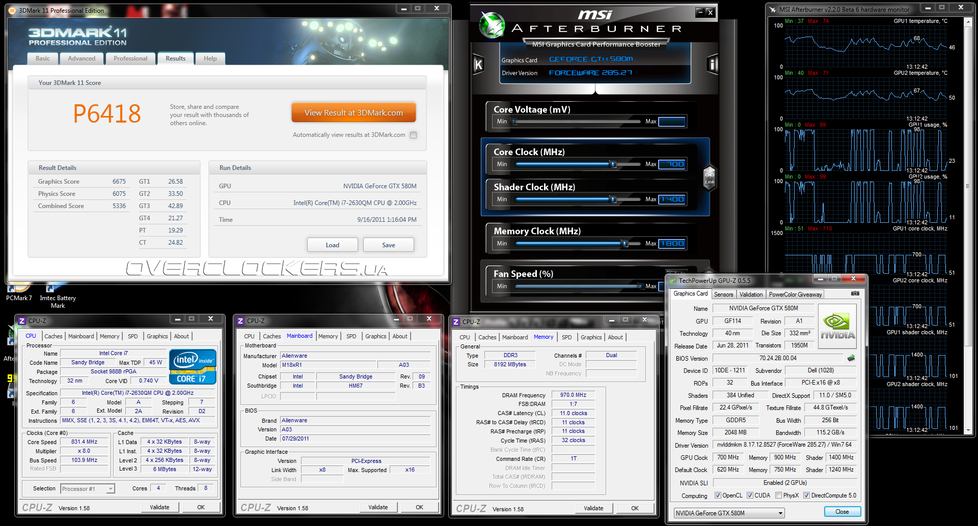 Как видим, у соперников общий балл ниже GPU Score. В обоих случаях мы уперлись в производительность процессора. Результат на SLI GeForce GTX 580M на 7% ниже, чем у настольной системы с обычным GeForce. Но при разгоне Alienware вплотную подбирается к сопернику.