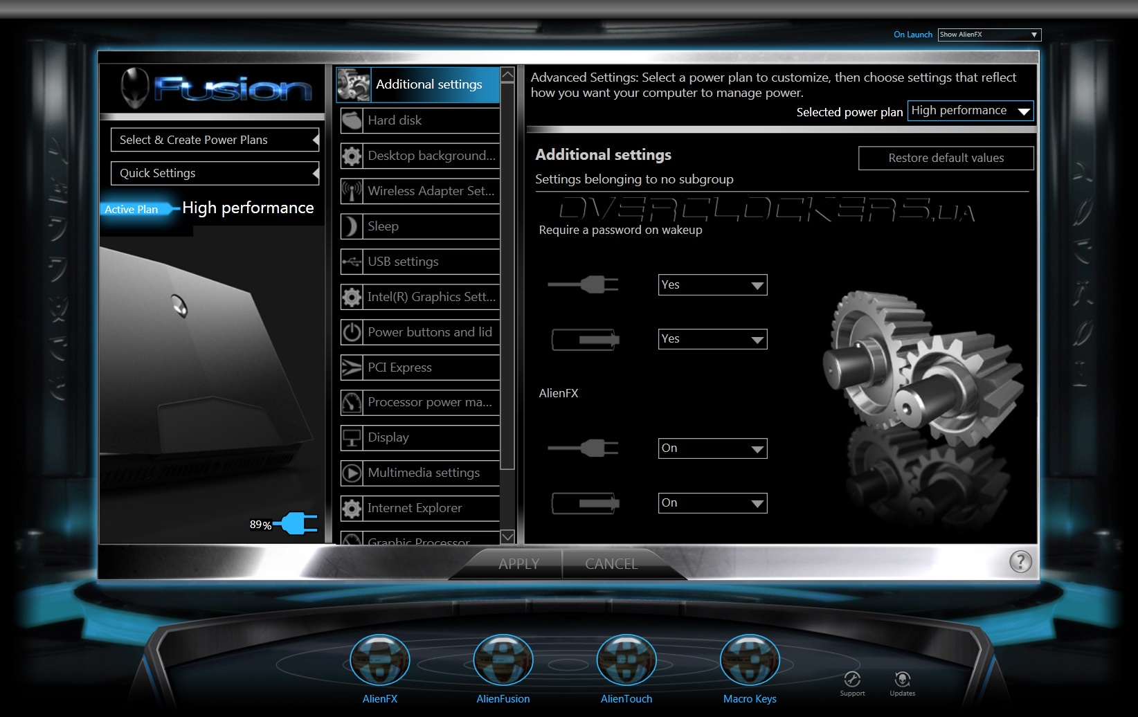 Ноутбук оснащен операционной системой Windows 7 Home Premium x64. Для управления основными функциями и специальными возможностями предназначено приложение Alienware Command Center. Программа имеет несколько вкладок. На одной назначаются функции боковых программируемых клавиш и задаются цветовые профили для специальной клавиши, меняющей подсветку.