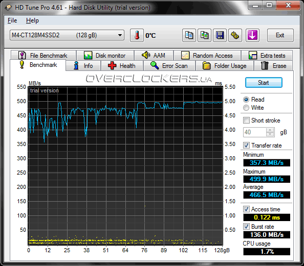 Настало время оценить производительность нашего «пришельца». Для начала взглянем на результаты тестирования накопителя SSD Crucial. Для этого мы использовали HD Tune Pro 4.61 и Disk Benchmark из AIDA64 1.85. Накопитель размечен в виде одного системного раздела в NTFS, на который и установлена рабочая операционная система. В связи с этим тесты записи HD Tune провести нельзя, поэтому приводим лишь скриншоты тестирования скорости линейного чтения при размере блока 128 Кбайт (вверху) и 1 Мбайт (внизу).