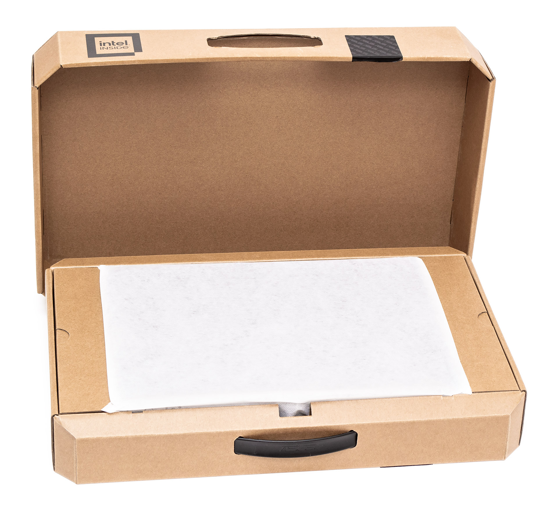 Ноутбук приедет к своему новому владельцу в оригинальной восьмиугольной коробке. Здесь есть удобная ручка для переноски, которая одновременно не дает коробке раскрыться, если разорвана упаковочная пломба. Со стороны и сзади на упаковке есть наклейки с серийными номерами и перечнем основных технических характеристик продукта.