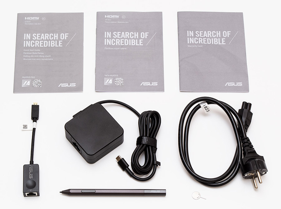 В комплекте с устройством есть три брошюры в составе двух кратких руководств пользователя (лучше скачать полную инструкцию с официального сайта) и информации о гарантии. Кроме этого есть переходник из порта micro HDMI на RJ45 для подключения проводной сети, блок питания, силовой кабель к БП, стилус и маленький ключик для отпирания лотка Nano SIM.