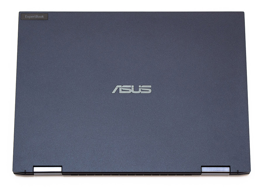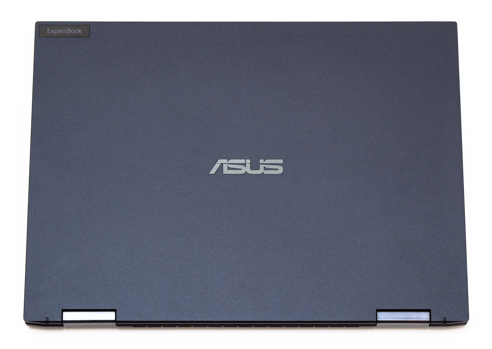 Корпус ASUS ExpertBook B7 Flip сделан из достаточно прочного и легкого алюминиево-магниевого сплава, приятного на ощупь. В закрытом положении он отлично выдерживает все нагрузки на диагональное скручивание. Недаром для устройства декларируется соответствие военному стандарту MIL-STD810H. Особый стиль добавляет и цвет «ночного звездного неба» на пересечении синего и черного, который может переливаться едва заметными вкраплениями под определенными углами освещения. Но самое важное, что покрытие хорошо противостоит загрязнению и легко оттирается от отпечатков пальцев. Верхняя панель крышки ровная и однотонная. Посередине на ней есть серебристый логотип ASUS. В верхнем правом углу, в черной вставке с надписью ExpertBook встроен красный светодиод, который можно включить, чтобы предупредить других о том, что лучше не отвлекать собеседника. По бокам у шарниров сделаны небольшие технологические наросты, на которые опирается крышка при больших углах наклона.
