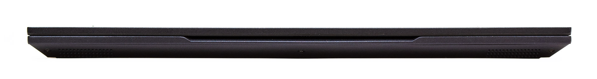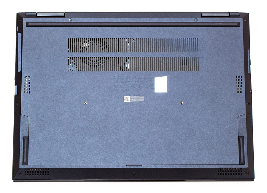 На нижней панели ноутбука есть две небольшие резиновые ножки по углам спереди, и одна длинная резиновая ножка параллельно задней грани. Ниже находится основной массив отверстий для забора воздуха. А еще ниже есть информация о продукте и программном обеспечении. Динамики прячутся за двумя решетками по бокам передней грани. Кстати, все боковины устройства наклонены внутрь, что упрощает его подъем и переноску.