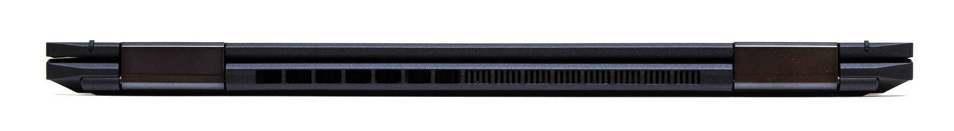 Отверстия отвода теплого воздуха от вентилятора расположены на задней грани нижней части ноутбука, в промежутке между шарнирами.