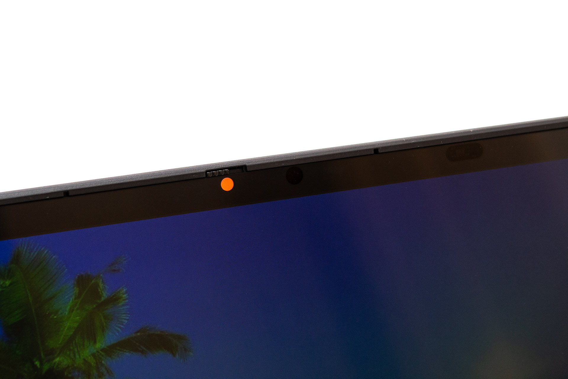 У экрана достаточно широкие рамки. Сверху по центру находится окуляр основной камеры, закрывающийся механическим ползунком красной шторки. По бокам от ползунка есть отверстия двух микрофонов, левее камеры есть индикатор ее работы, а правее основной камеры находится инфракрасная камера с функцией Windows Hello и датчик приближения.