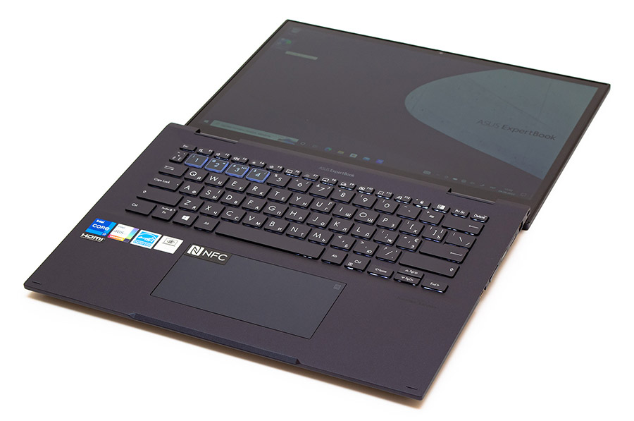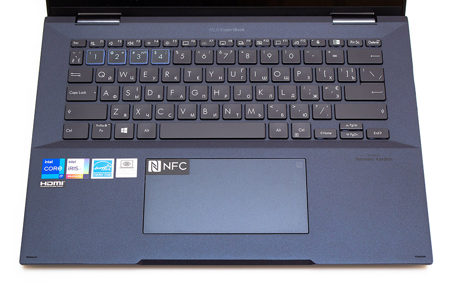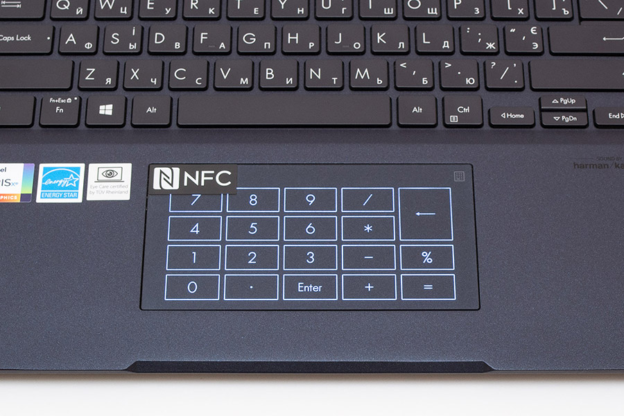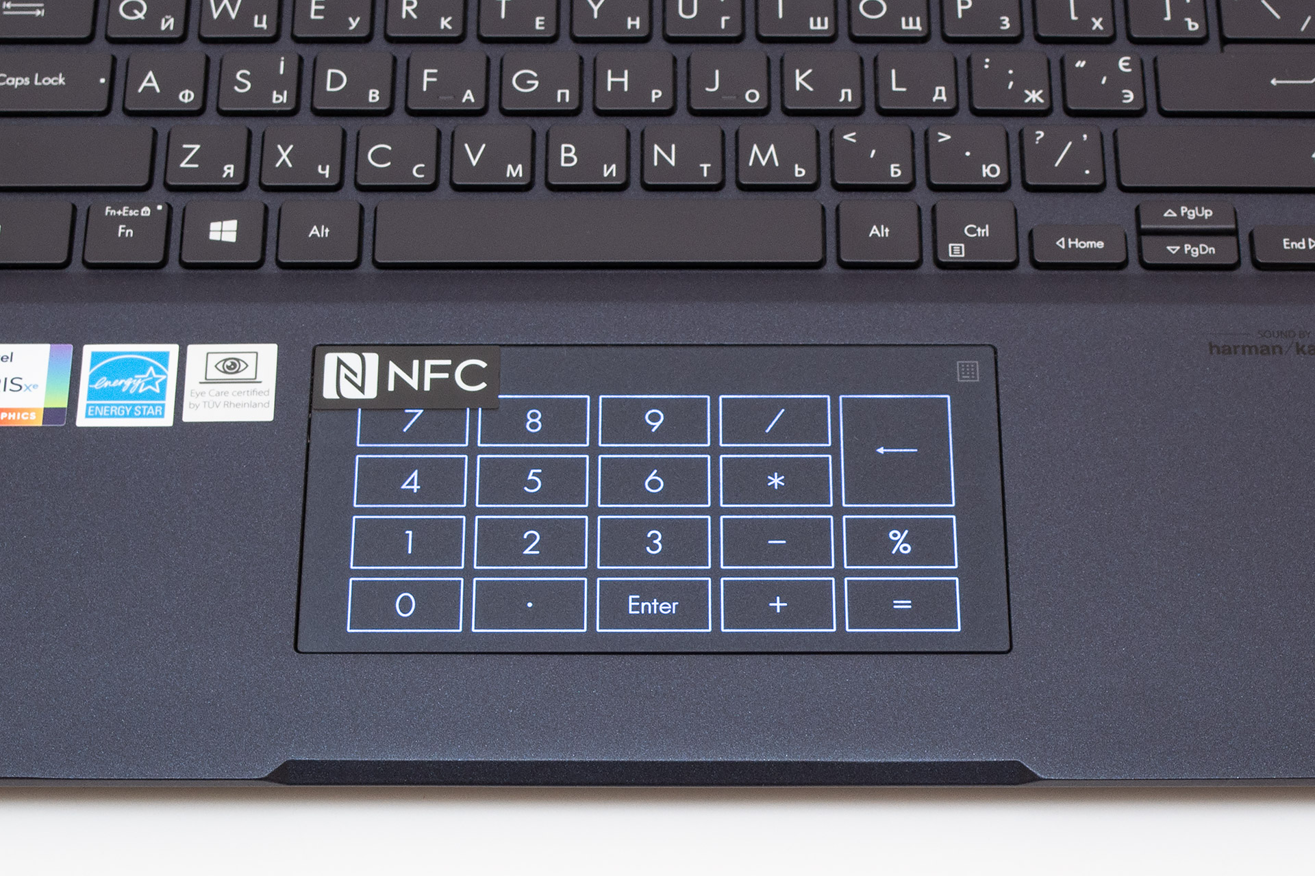 Чувствительный тачпад имеет размеры 130x66 мм. Поверхность его матовая и скользкая. Под левым и правым нижними углами скрыты соответствующие механические клавиши. Поддерживается распознавание четырех пальцев одновременно и около 20 интуитивно понятных жестов. Если удерживать палец секунду в правом верхнем углу, включится технология ASUS NumberPad и на тачпаде появятся подсвеченные контуры кнопок виртуального сенсорного цифрового блока. И это еще не все. Сюда же встроен считыватель NFC. Для корректной работы следует разместить соответствующую карту или устройство по центру тачпада, не ближе 5 мм от его граней.