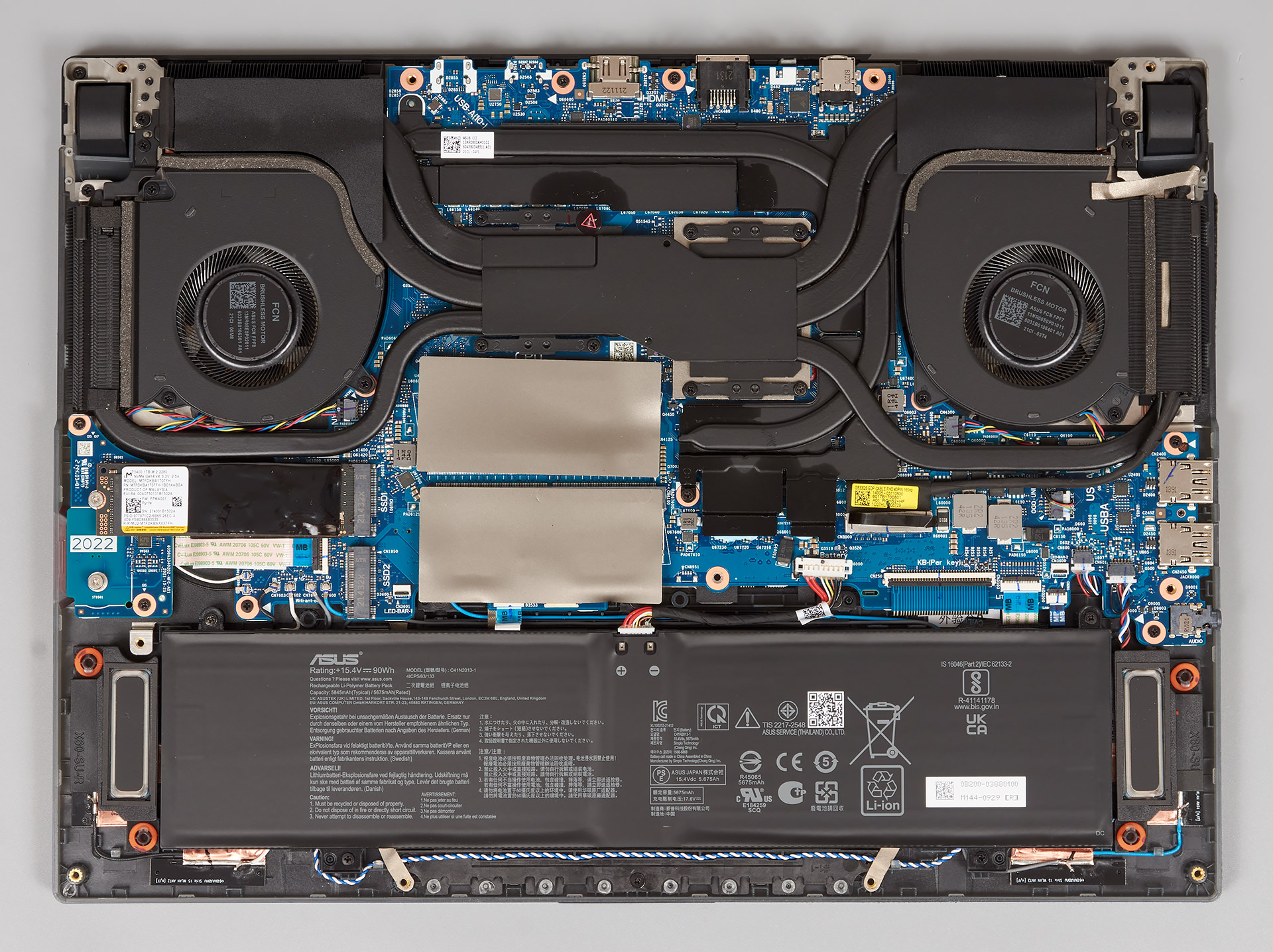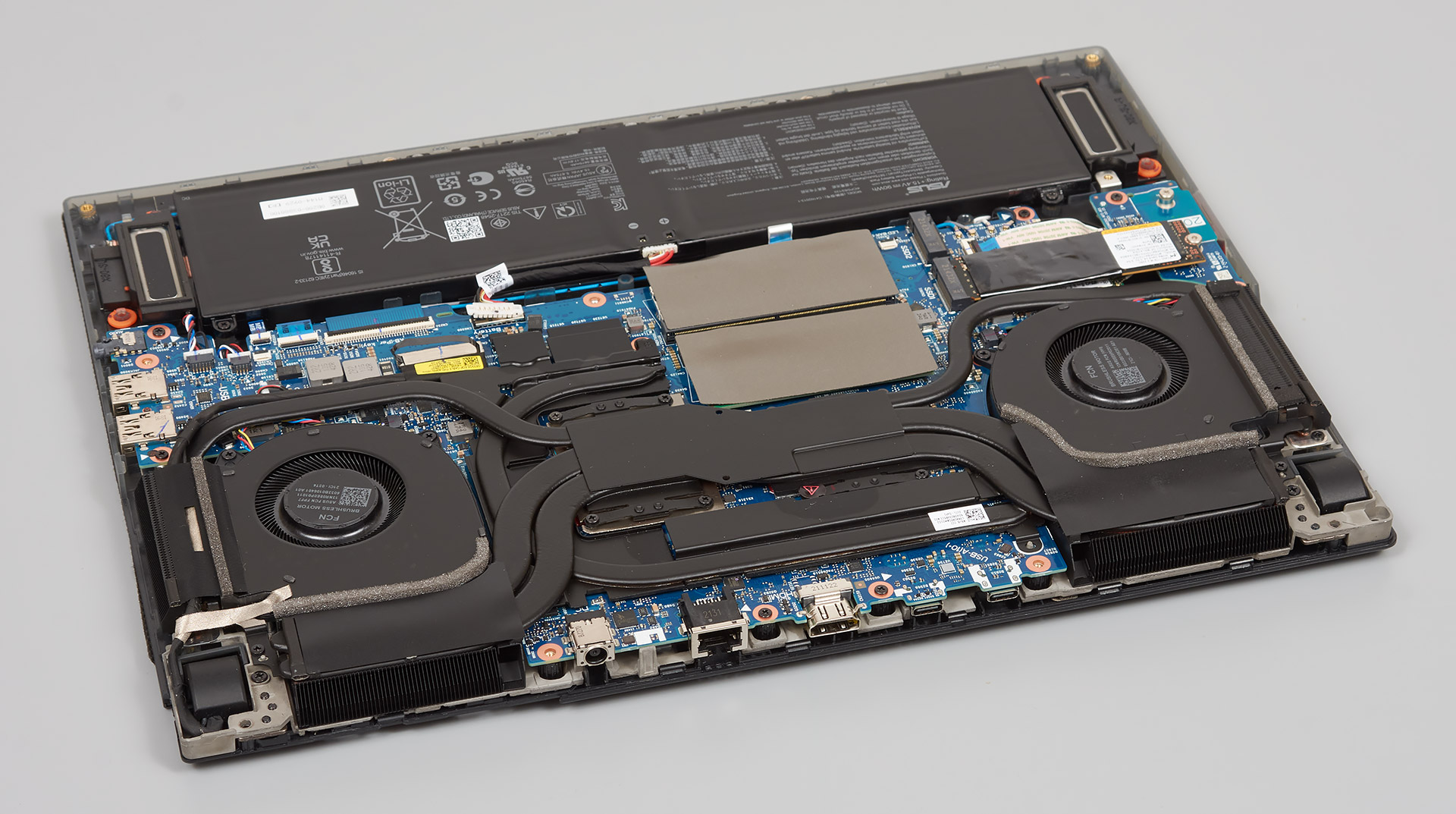 Общая компоновка стандартная, плата с системой охлаждения, состоящая из двух «турбин», занимает 2/3 площади ноутбука.