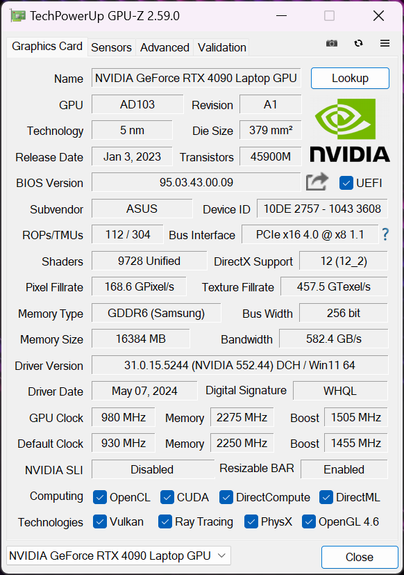 Мобильная дискретная видеокарта Nvidia GeForce RTX 4090 имеет ограничения по мощности до 80 Вт с максимальным значением 125 Вт, что значительно ниже, чем в большинстве других игровых ноутбуков с такой картой. И то, такое значение буде доступно при разгоне через программу Armoury Crate, тогда как в стандартных режимах — 115 Вт максимум. Частота GPU составляет 930 МГц с ускорением до 1455 МГц, память работает с быстродействием 18 ГТ/с.