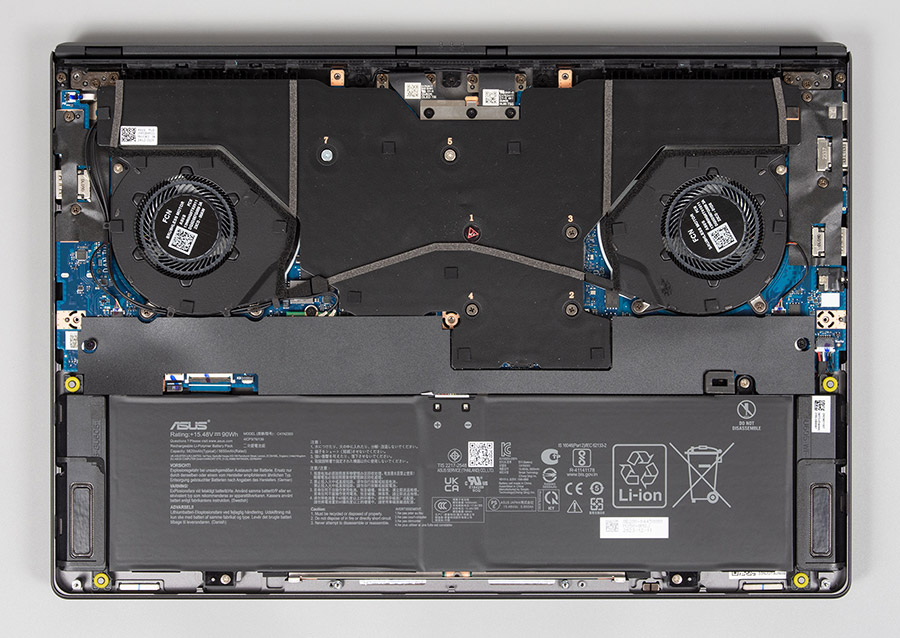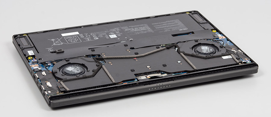 В системе охлаждения используется испарительная камера и два центробежных вентилятора с радиаторами, горячий воздух от которых выходит только через заднюю часть устройства — в сторону и вниз.