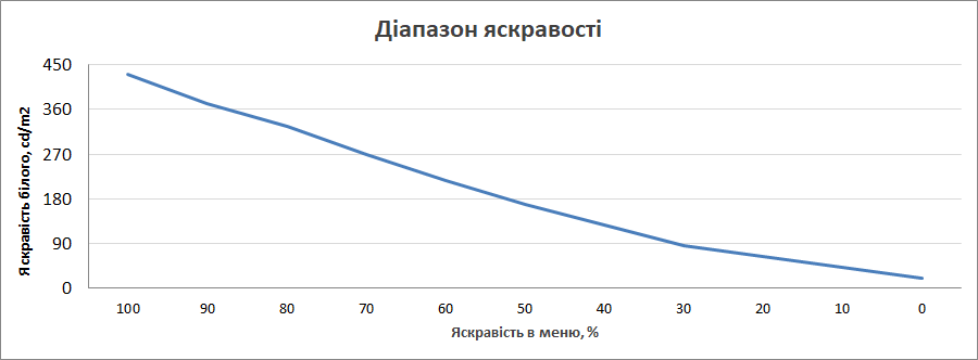 Яркость изменяется в диапазоне 20–430 кд/м², что несколько меньше заявленных 500 кд/м², которые, скорее всего, доступны в режиме HDR.