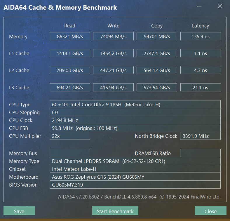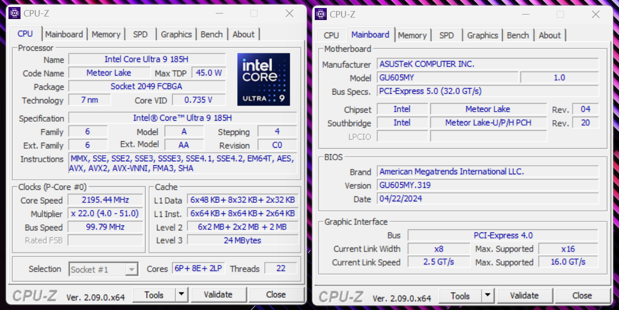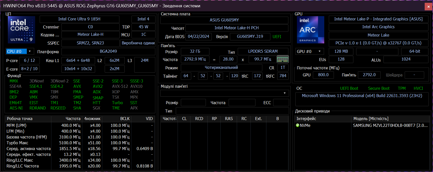 ASUS ROG Zephyrus G16 (2024) GU605 на базе новейшего флагманского процессора Intel Core Ultra 185H архитектуры Meteor Lake, который в своем составе имеет шесть производительных ядер с поддержкой Hyper-Threading, восемь энергоэффективных и еще два энергоэффективных ядра в SoC, что дает возможность обрабатывать данные в 22 потока. Также у него есть блок ускорения искусственного интеллекта, так называемый NPU. Базовая частота CPU составляет 2300 МГц, но благодаря технологии Turbo Boost он может ускоряться до 5100 МГц по P-ядрам и 3800 МГц по E-ядрам, а также до 2500 МГц по LP E-ядрам. Кэш-память третьего уровня составляет 24 МБ, уровень TDP равен 45 Вт, но при ускорении он в пике может достигать 115 Вт.