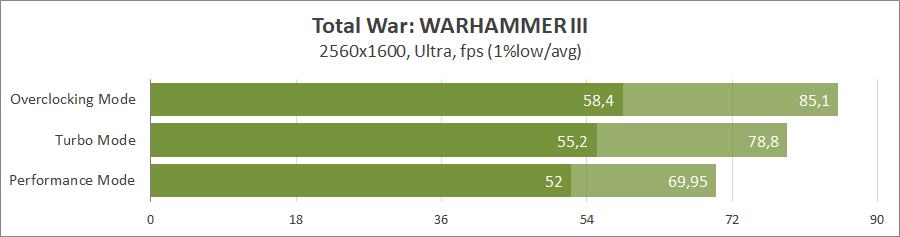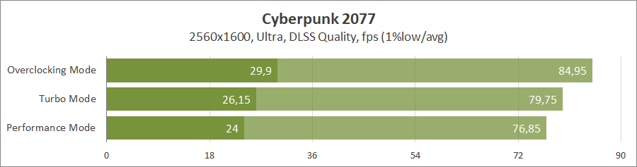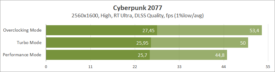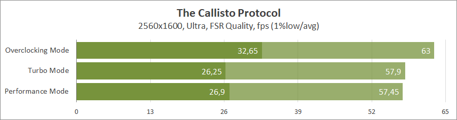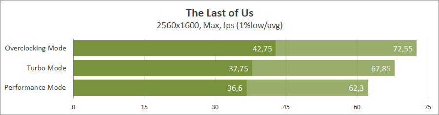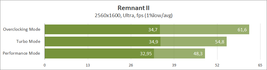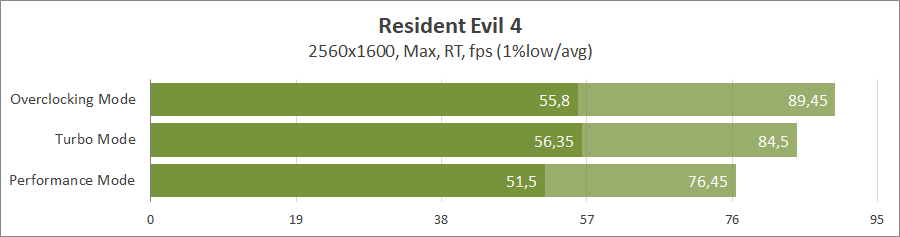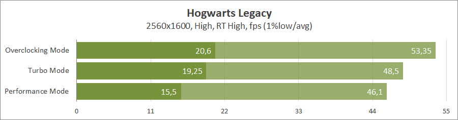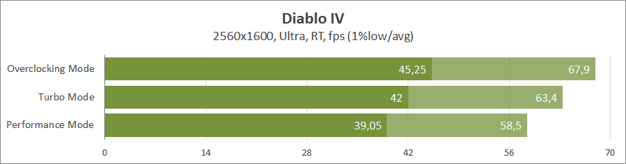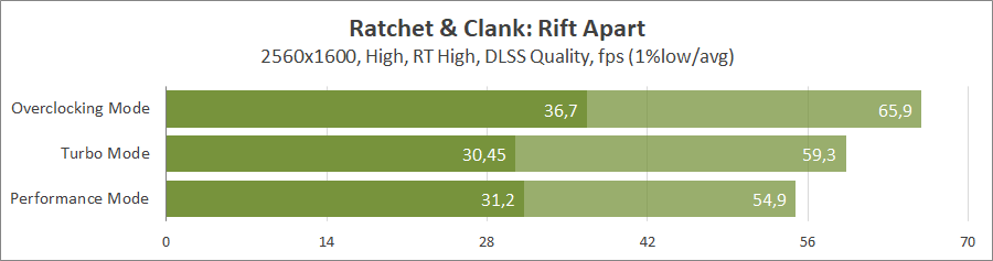 В играх мы проверим три режима: Performance, Turbo и Overclocking. Использовалось разрешение 2560x1600 и пресеты с максимальным или высоким качеством графики и трассировкой лучей, где они имелись, с активированной технологией DLLS в режиме качество. В игре Diablo IV совершалась пробежка в течение минуты через город Kyovashad в сторону храма, также пробежка совершалась в Hogwarts Legacy через городок Hogsmeade в сторону Old Fool. В Ratchet & Clank: Rift Apart, Remnant II и Resident Evil 4 совершалась прогулка в течение минуты в начале стартового уровня, в The Last of Us — на уровне после пролога.