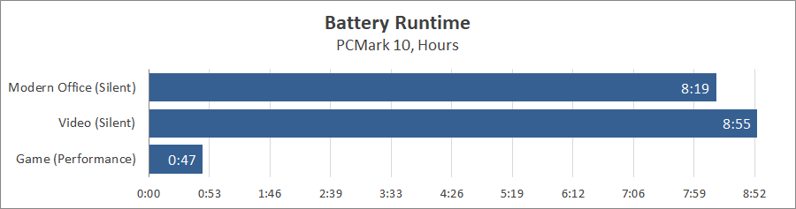 Для проверки времени работы от аккумулятора было проведено несколько тестов с помощью PCMark. Тест Modern Office симулирует комбинированную офисную нагрузку. Второй тест измеряет время проигрывания видео формата Full HD, а Game позволяет понять, сколько сможет работать ноутбук под игровой нагрузкой. Яркость экрана зафиксирована на 120 кд/м², чтобы сравнить результаты с другими ноутбуками. Подсветка клавиатуры выключена, громкость динамиков была выставлена на 20%. В обычных тестах использовался режим работы ноутбука Silent с Eco для видеокарты, для игр — Performance с Maximum.
