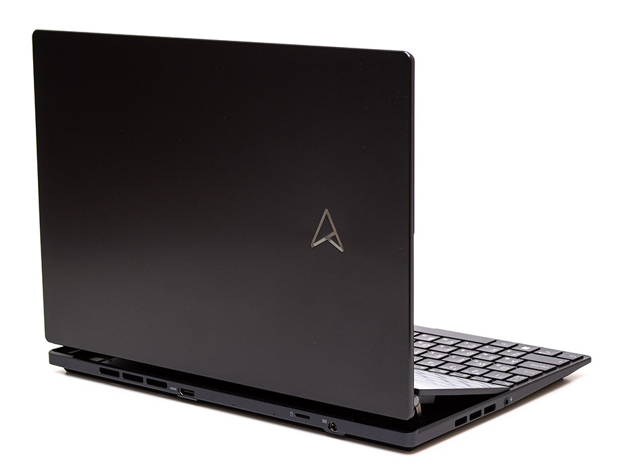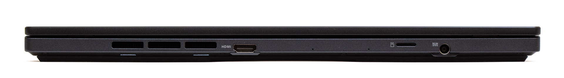 На задней части корпуса ноутбука есть небольшая выхлопная решетка вентиляции. Около центра расположен выход HDMI 2.1. Дальше находится два малозаметных отверстия, скорее всего — это фоновые микрофоны. И ближе к левой стороне находится разъем для блока питания и щель MicroSD кардридера.