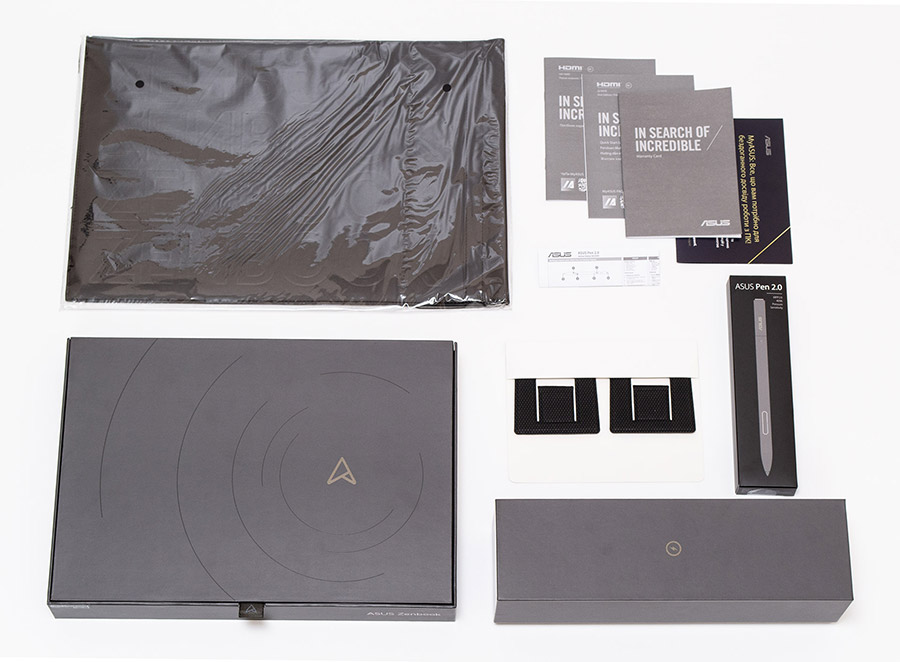Внутри можно обнаружить уже более эстетически изысканные упаковки серого цвета. В одной из них скрывается сам ноутбук, документация к нему и клейкие ножки (по бокам этой коробки установлены мягкие демпферы). В другой — блок питания с силовым кабелем и коробочка со стилусом и аксессуарами к нему. Оригинальный чехол сложен сбоку, в отдельной картонной нише.