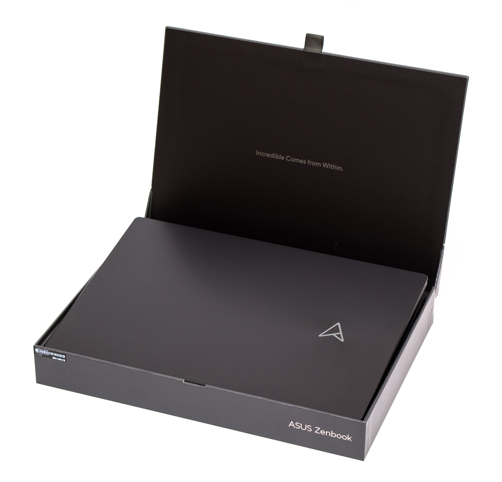 Коробка, в которой находится ноутбук, при открывании поднимает его на своеобразном постаменте (для большего драматического эффекта на фото, упаковочные пленки предварительно были сняты с устройства). Надпись на обороте крышки утверждает, что «невероятное появляется изнутри».