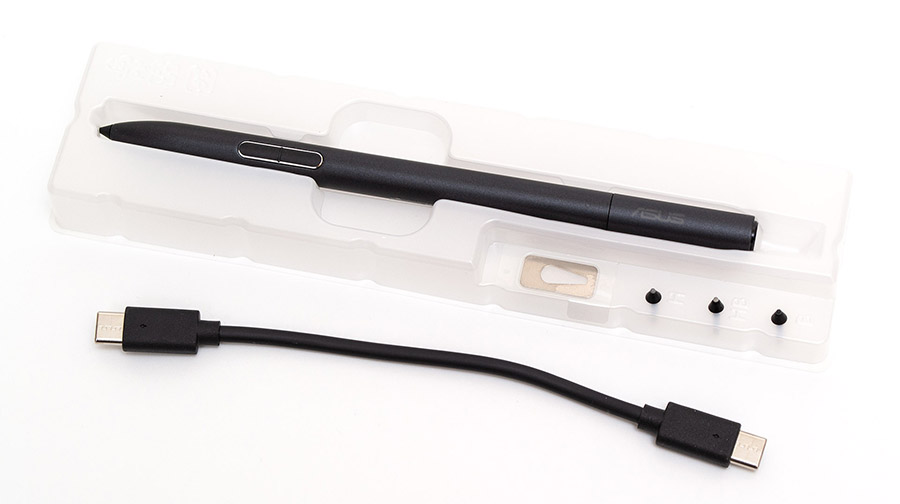 Еще одним очень приятным аксессуаром к этой модели является фирменный стилус Asus Pen 2.0 (SA203H). Он имеет габариты 164х10 мм и вес 16 грамм. В комплекте есть четыре сменных стержня разной «твердости». Работает устройство по технологии MPP 2.0 с частотой опроса в 266 Гц, различает 4096 степеней нажатия в диапазоне усилия от 5 до 350. В передней части есть две механические кнопки. Нижняя отвечает за «стирание», верхняя выполняет функцию правой клавиши мыши. Еще одна кнопка сзади, на колпачке, переключает функции устройства (например, позволяет сделать скриншот, или пролистать кадр презентации). Питается Asus Pen 2.0 от встроенного аккумулятора, которого хватает на 140 часов непрерывной работы, а для подзарядки требуется не более 30 минут. Для зарядки нужно отодвинуть колпачок, открыв порт USB Type-C, и подсоединить к нему соответствующий кабель (длиной 100 мм и весом 5 граммов). Цветной индикатор слева от порта покажет текущий статус зарядки и подключения по Bluetooth.