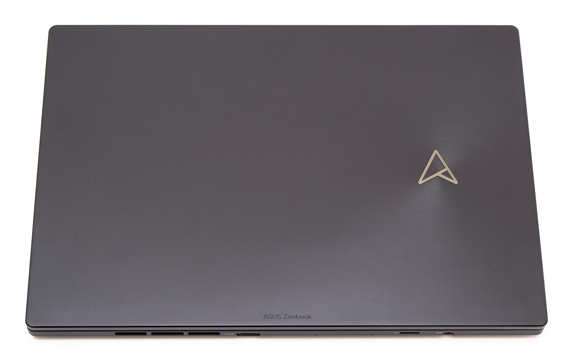 Корпус ASUS Zenbook Pro 14 Duo OLED полностью металлический и изготовлен из сплава магнезия и алюминия. Он обладает необычайной прочностью и идеально противостоит диагональной нагрузке. Производитель не зря декларирует для устройства соответствие военному стандарту США MIL-STD810H. Верхняя панель с левой стороны содержит обновленный серебристый логотип ASUS в виде стилизованной буквы А (привет Звездному флоту из Star Trek). От него концентрическими кругами расходятся «волны» не ощутимой на ощупь шлифовки. У нижней грани есть едва заметная гравированная надпись ASUS Zenbook. Поверхность хорошо собирает пыль и отпечатки пальцев, хотя чистить их можно довольно легко. Углы корпуса округлены по небольшому радиусу.