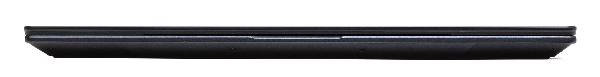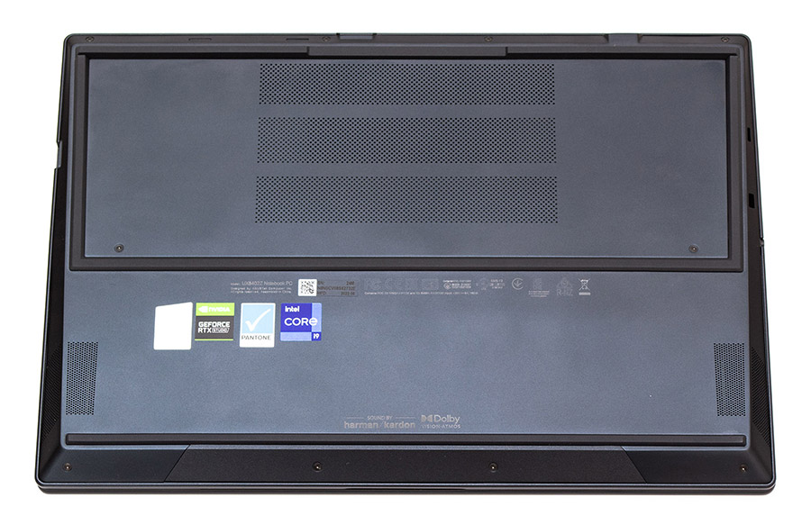 Нижняя панель ноутбука имеет наклонные грани для создания впечатления более тонкого корпуса. По сторонам спереди есть отверстия динамиков. Еще больше вентиляционных отверстий (примерно 1/6 от общей площади) занимают место позади в центре. Ножки выполнены интересно — одна сплошная пролегает вдоль передней грани, а вторая образует сзади большой прямоугольник с перепадами высоты.