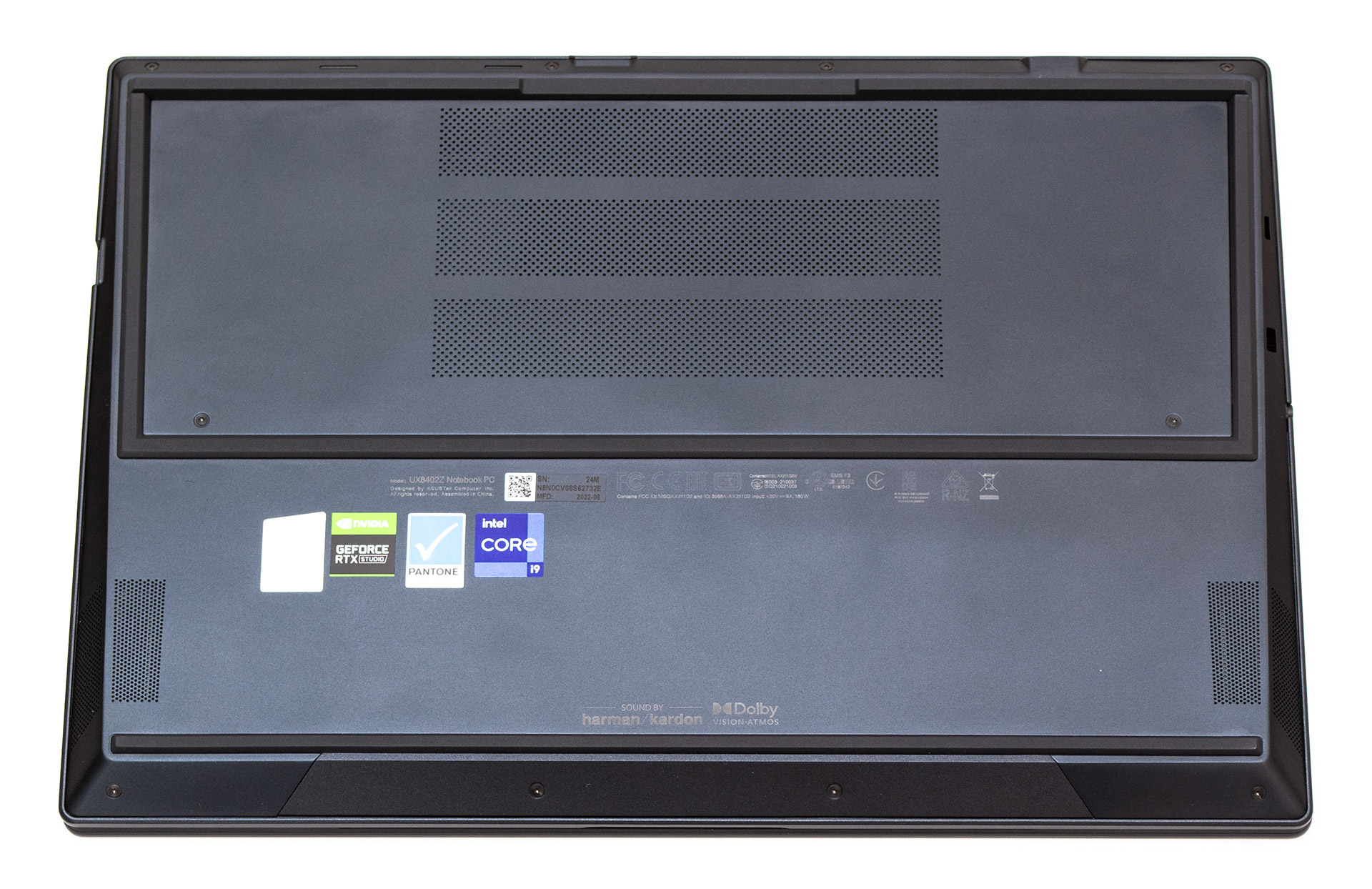 Батарея на 76 Вт·ч находится в передней части корпуса в области под клавиатурой. По бокам от нее обустроены два акустических динамика Harman Kardon, а спереди слева и справа встроены антенны беспроводной связи. Материнская плата и вся остальная начинка расположены в зоне под дополнительным экраном.