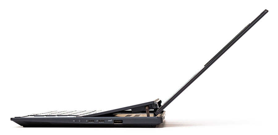 Главная особенность ASUS Zenbook Pro 14 Duo OLED — дополнительный дисплей, расположенный над клавиатурой. Он остался на своем месте, но по сравнению с предыдущими версиями ноутбуков изменилась его конструкция. В первых моделях этот экран вообще был вмонтирован в корпус, потом он стал подъемным. Здесь пошли еще дальше и при сборке эта деталь полностью прячется в корпус и держит на себе крепеж основного дисплея.