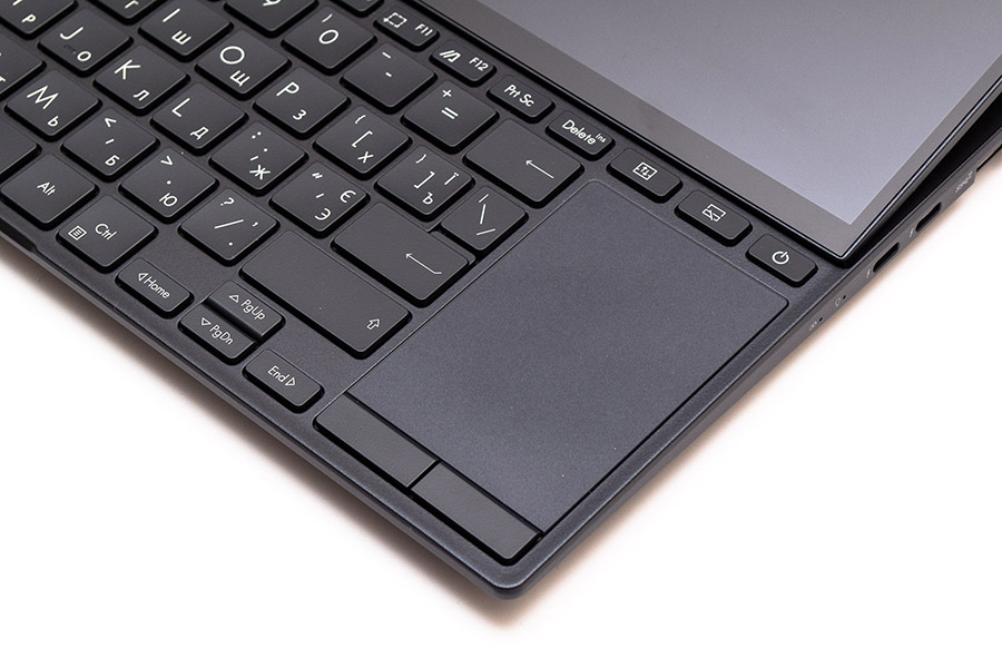 Клавиатура ASUS Zenbook Pro 14 Duo OLED смещена в нижнюю половину корпуса ноутбука. Она островного ножничного типа с расстоянием в 18,5 мм между центрами кнопок и приближенной к ANSI раскладкой. Хотя клавиши и кажутся плоскими, на самом деле они немного утоплены внутрь. Общий ход при нажатии составляет 1,4 мм. Латинская и кириллическая гравировка мягко и четко подсвечивается белым цветом с тремя уровнями яркости. Индикаторы Caps Lock, активность микрофона и камеры встроены в соответствующие кнопки. Дополнительный сенсорный экран, покрытый матовым антибликовым покрытием, кроме своей прямой функции отображения и оперирования с информацией, может использоваться в качестве тачпада. Для этого должна быть включена соответствующая функция, при которой прикосновение тремя пальцами одновременно включает режим тачпада.