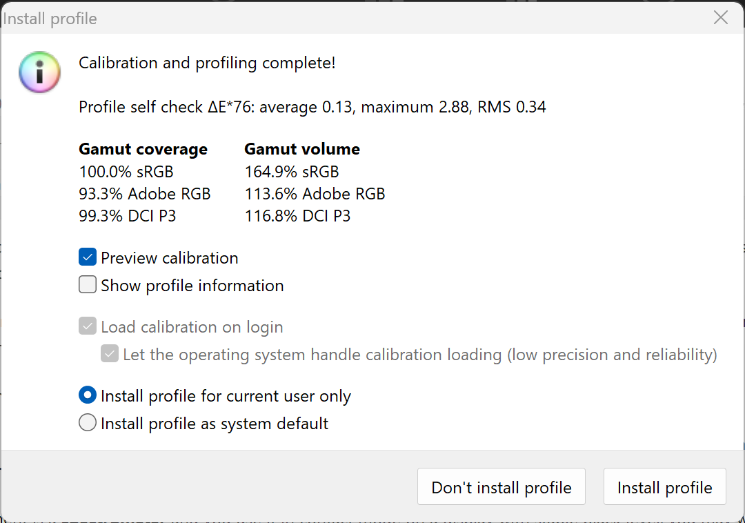 Дисплей ноутбука поддерживает четыре варианта цветовых схем, которые переключаются в приложении MyASUS: Native (насыщенные цвета OLED), sRGB (точные цвета для веб-контента), DCI-P3 (кинематографическая цветовая гамма), Display P3 (расширенный спектр). Все измерения производились в режиме Native с отключенным HDR и на фабричном ICC профиле, установленном из «коробки». По нашим измерениям экран обеспечивает покрытие цветового пространства sRGB на уровне 100%, Adobe RGB 93,3% и DCI P3 в 99,3%. Объемы цветового пространства значительно больше и их должно хватать для работы с дизайном, цветом и графикой в целом.