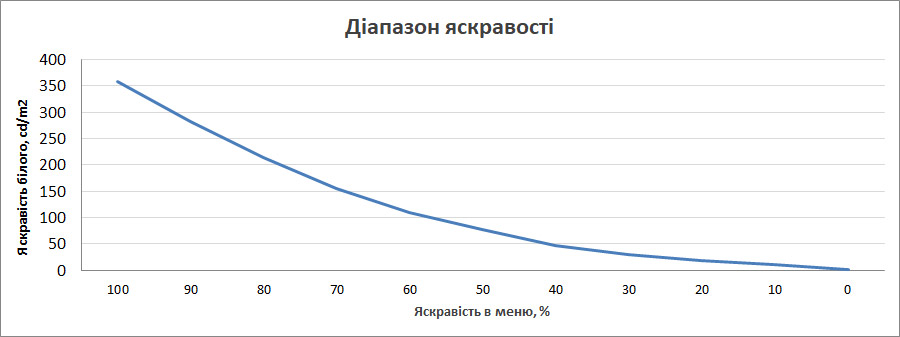 Яркость регулируется в диапазоне от 0,8 до 358 кд/м2 (по нашим измерениям). Коэффициент контрастности инструментально не устанавливается, поскольку прибор выдает значение бесконечности. Примем на веру, что он достигает 1 000 000:1. Все последующие измерения производились при освещенности в 120 кд/м², что соответствует 63% яркости. Именно этого значения определенно хватит пользователю в большинстве случаев, кроме пребывания под ярким солнцем.