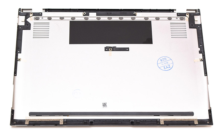 На нижней панели ноутбука есть одна длинная резиновая ножка впереди и еще одна такая же сзади. Две небольшие решетки для втягивания холодного воздуха вентиляторами находятся по бокам сзади. Щели отверстий акустических динамиков Harman Kardon расположены по сторонам впереди.