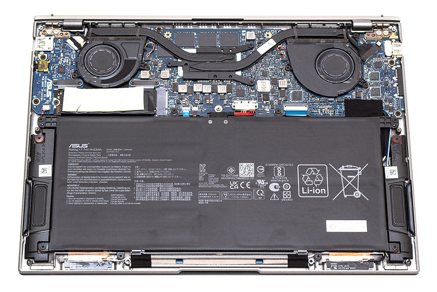 Батарея на 63 Вт·г находится в передней части корпуса, занимая большую его часть. По бокам от нее обустроены два акустических динамика Harman Kardon, а спереди слева и справа вмонтированы две антенны беспроводной связи. Материнская плата с распаянным на ней процессором, памятью и силовыми элементами расположена в задней части шасси.