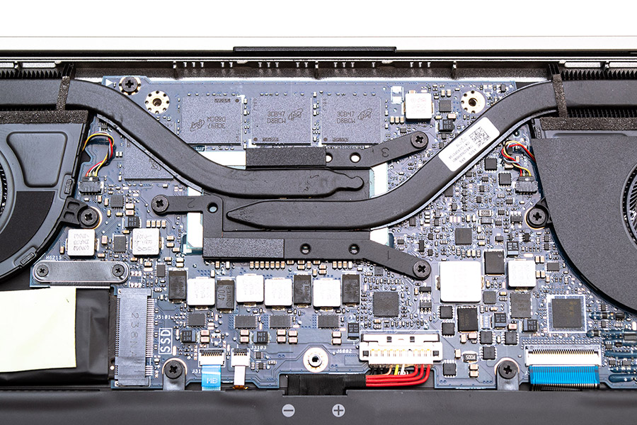 Система охлаждения процессора состоит из двух тепловых трубок и двух отдельных тонких центробежных вентиляторов, расположенных по сторонам от него. Рядом с процессором распаяны микросхемы оперативной памяти производства Micron.