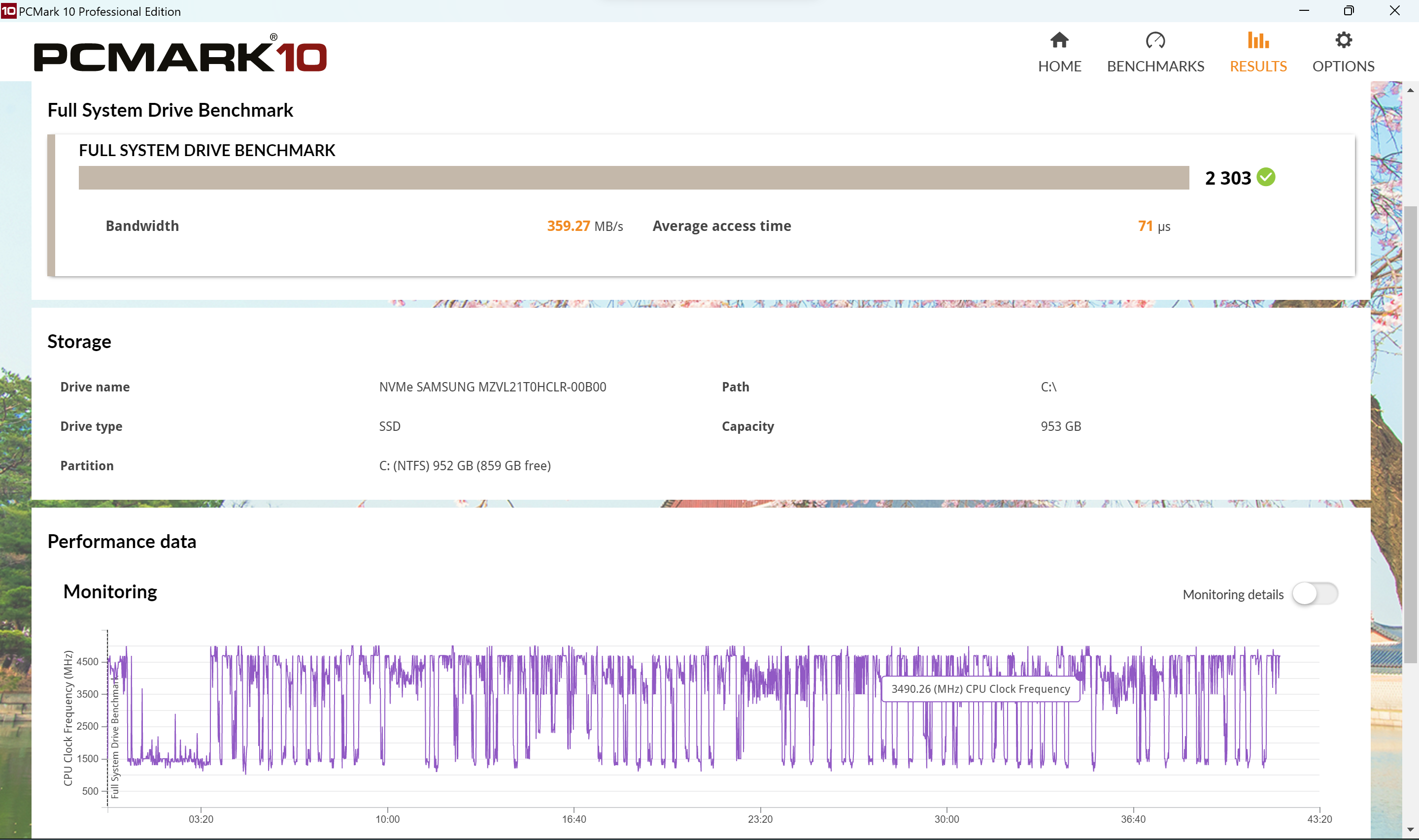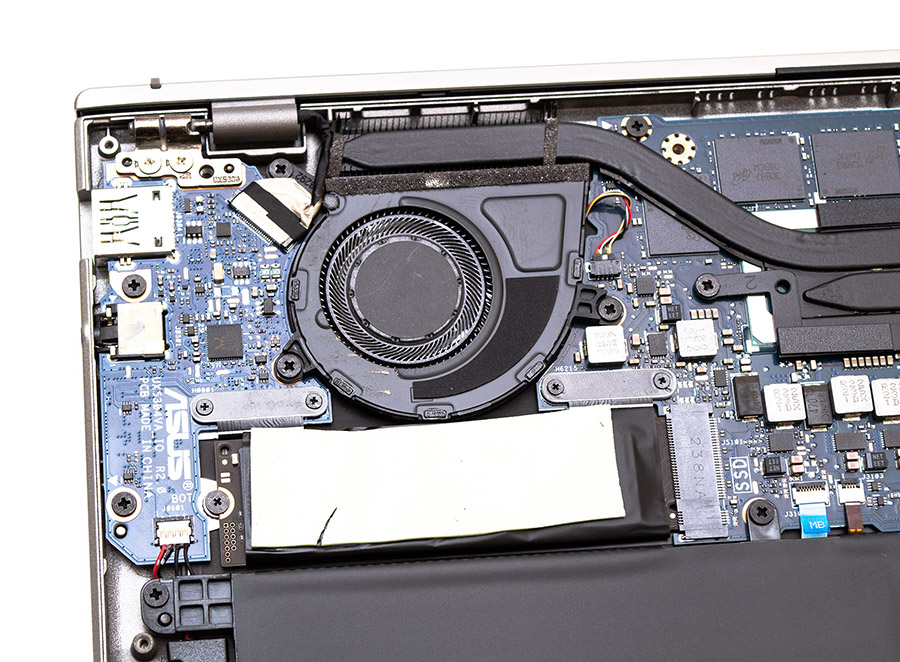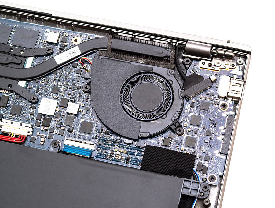 SSD NVMe M.2 (2280) накопитель на 1ТБ Samsung PM9A1 (MZVL21T0HCLR-00B00) скрывается под термической прокладкой ниже правого вентилятора. Это единственный элемент устройства, который пользователь может заменить самостоятельно и относительно легко, но потеряет официальную гарантию на устройство.
