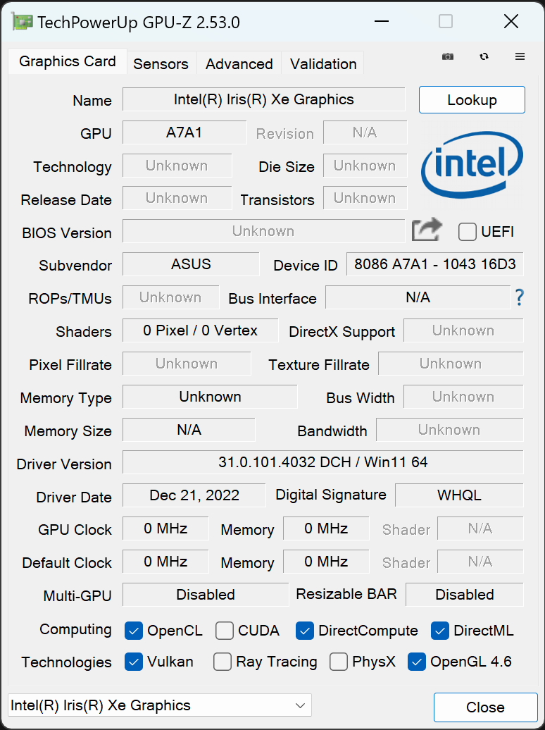 Для обработки и вывода изображения ноутбук полагается на встроенный графический чип Intel Iris Xe Graphics. К сожалению, подробной информации о нем GPU-Z также не предоставляет.