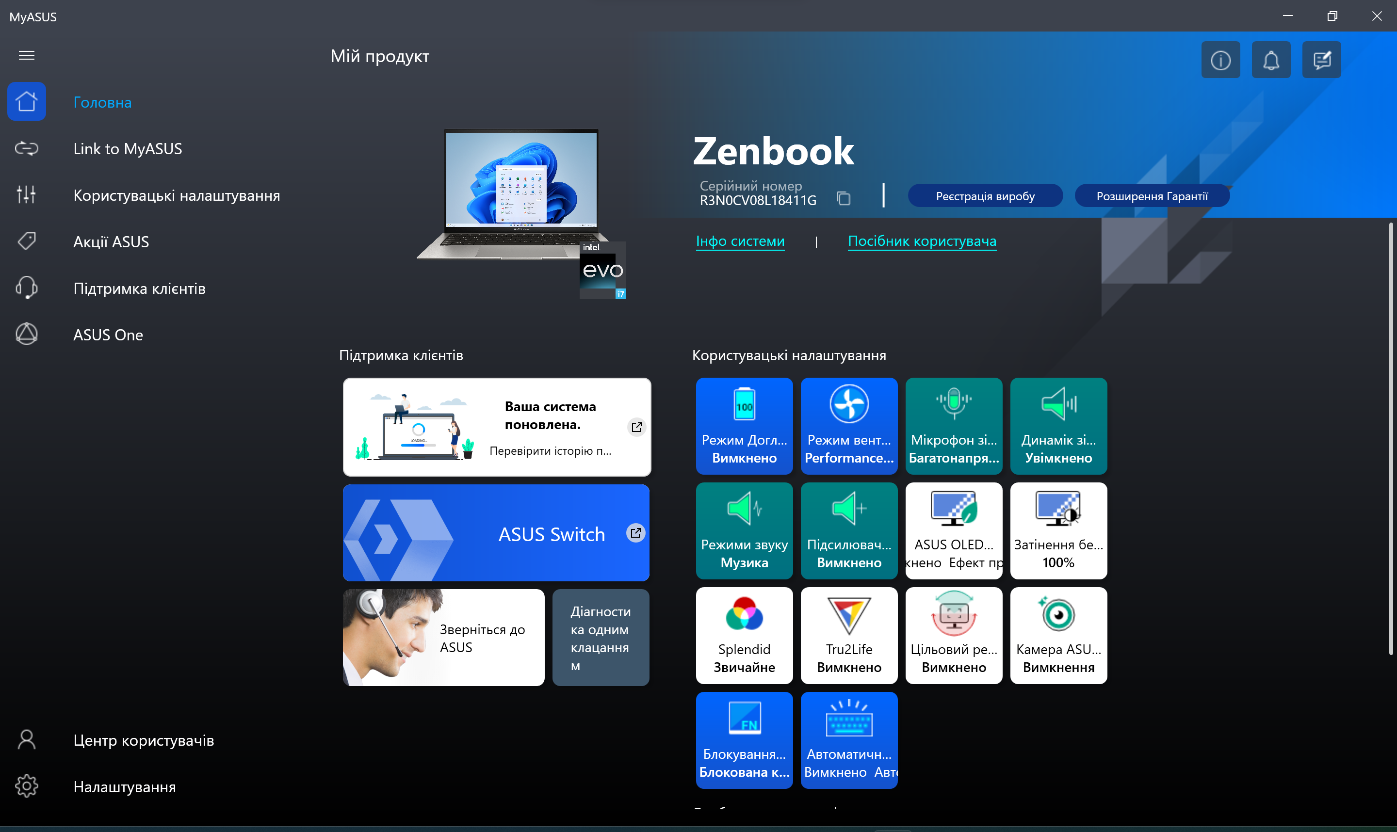 Фирменное приложение MyASUS позволяет настраивать все необходимые параметры устройства. В частности, режим потребления батареи, производительность железа и режим работы вентилятора, качество изображения на экране, аудиосистему, микрофон, беспроводное подключение и многое другое. Для расширения дополнительных возможностей можно установить приложения Link to MyASUS – для интеграции с мобильными устройствами, ScreenXpert — для управления окнами на разных подключенных дисплеях и GlideX — для совместного использования экрана и переноса изображения между различными устройствами в проводном или беспроводном режимах.