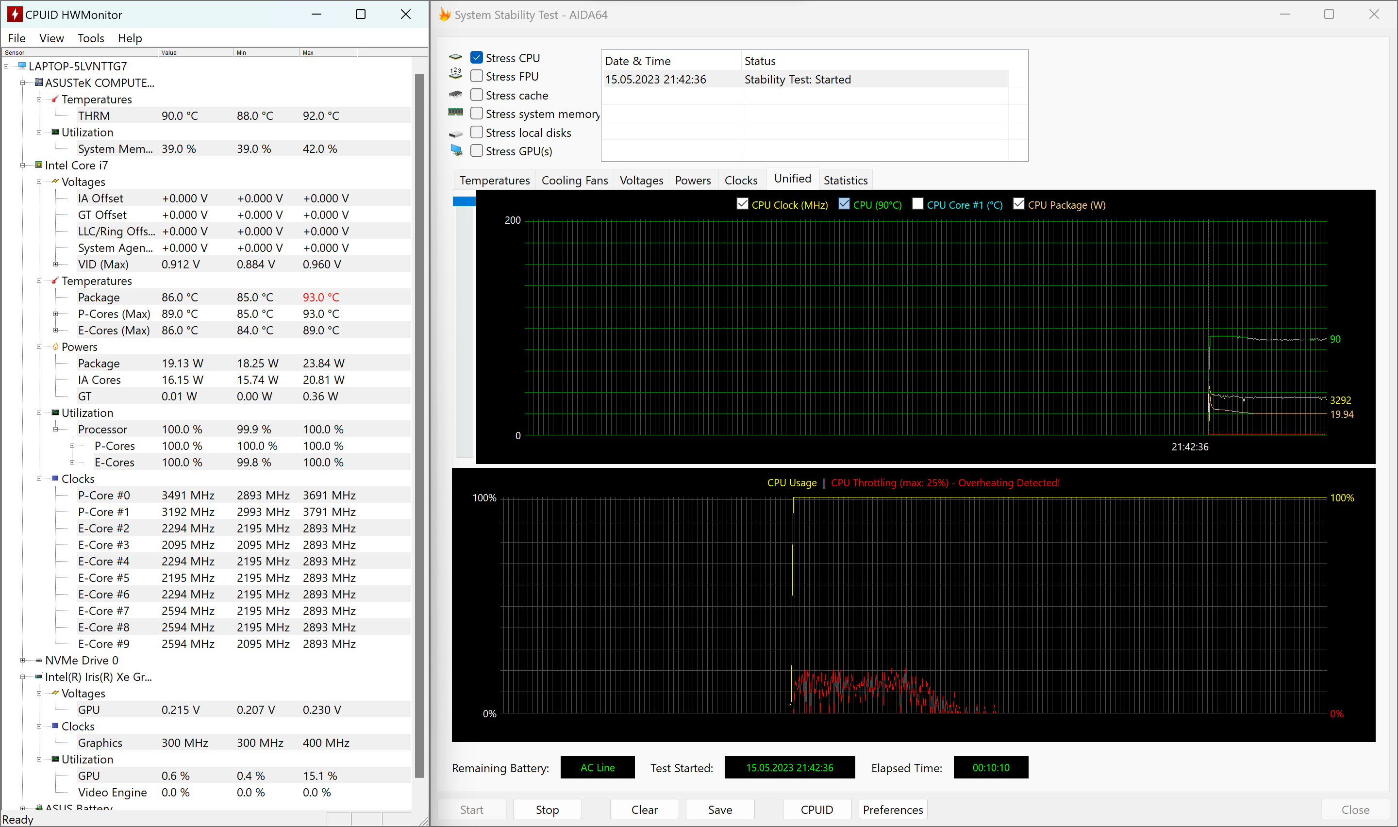 В нем, в начале нагрузки, частоты P-ядер процессора мгновенно доходят до почти 3,8 ГГц, а E-ядра удерживают около 2,9 ГГц. Процессор находится в 25% троттлинга около трех минут, после чего частоты снижаются и стабилизируются на 3,5 ГГц по P-ядрам и 2,6 ГГц по E-ядрам. Температура при этом удерживается в пределах 90 градусов.