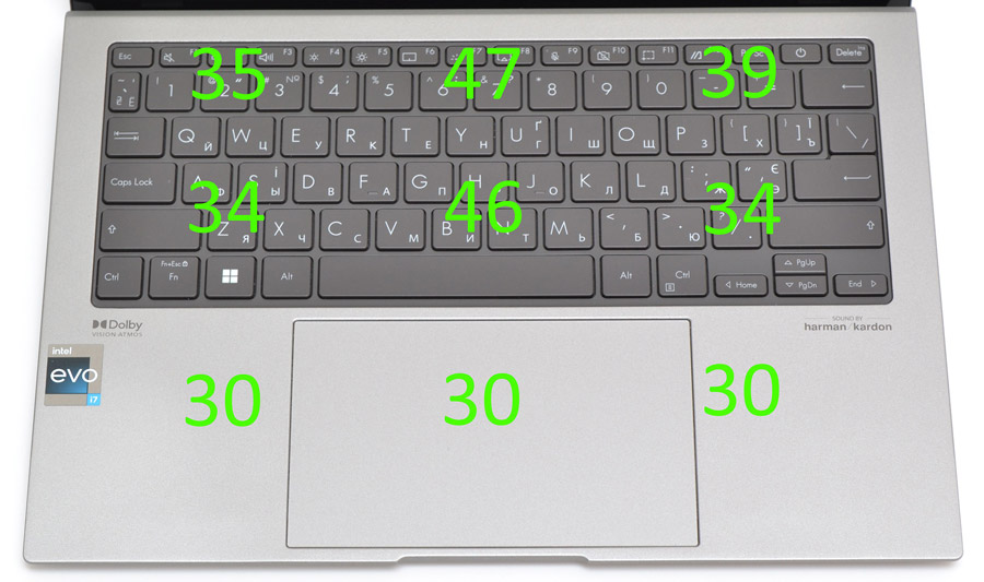 Клавиатура островного типа выполнена в зауженном модифицированном стандарте раскладки ANSI. Клавиатура несколько занижена по отношению к уровню корпуса и не имеет защиты от влаги. Расстояние между центрами кнопок составляет 18,7 мм. А по центру клавиш имеется едва заметное углубление в 0,1 мм. Полный ход клавиш составляет 1,1 мм. Похоже, что от пантографа под клавишами в этот раз решили избавиться, потому по тактильным впечатлениям это настоящая мембрана. Английская и украинская раскладка мягко и ясно подсвечиваются белым цветом с тремя уровнями яркости. Индикаторы Caps Lock, активность микрофона и камеры встроены в соответствующие кнопки. Кнопка запуска расположена в верхнем правом углу от Delete. Кстати, наклейка Intel Evo — это не о процессоре, а о требованиях к устройству в целом.