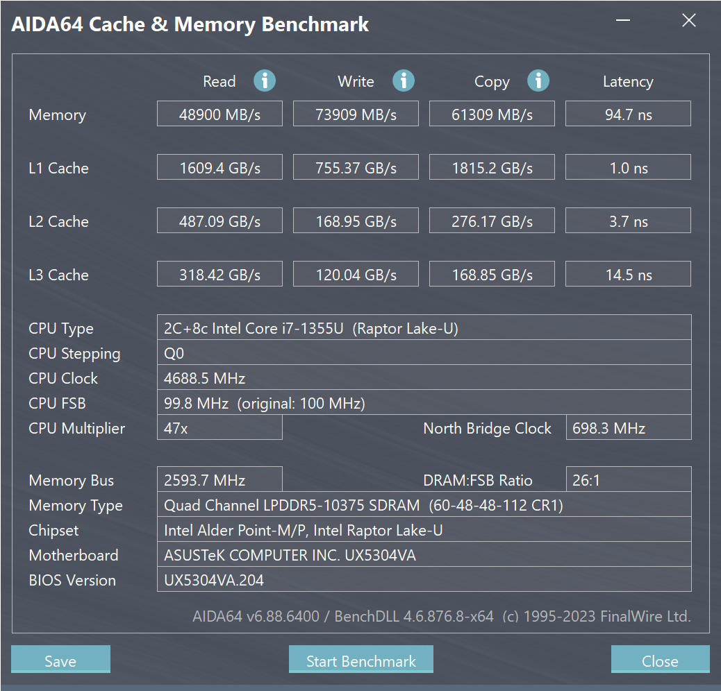 Встроенная память на 16 ГБ работает в «четырехканальном» режиме на частоте 5200 МГц с задержками 60-48-48-112-1Т (согласно данным с HWiNFO). CPU-Z почему-то показывает только объем памяти, OEM производителя и маркировку.