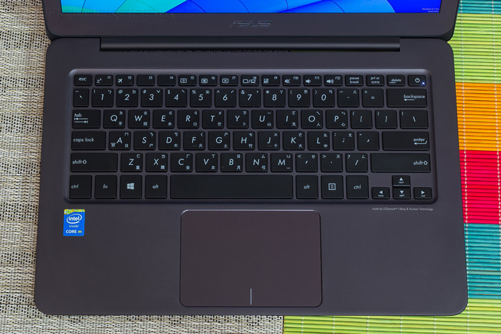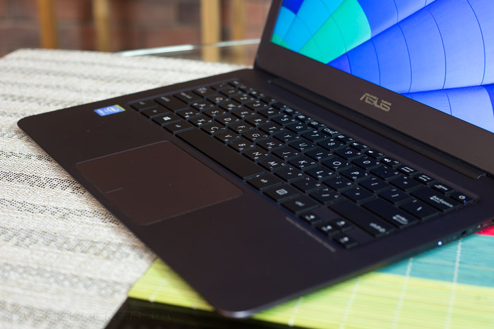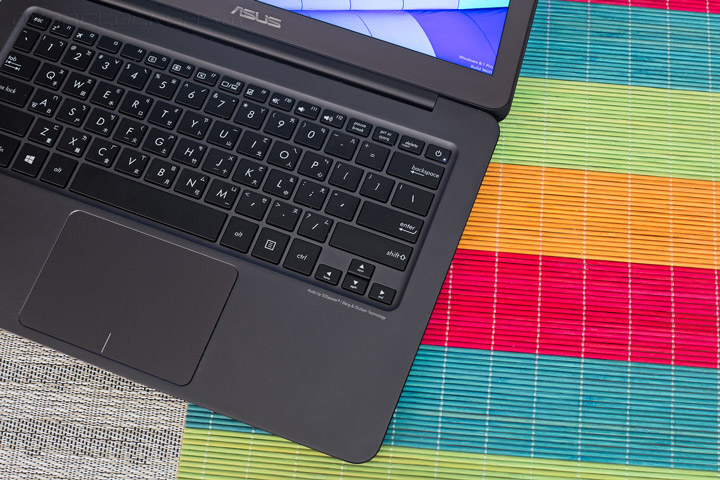 Клавиатура выполнена в привычном для 13,3″ устройств укороченном формате. Клавиша включения лэптопа расположилась в ее правом верхнем углу. ASUS не придерживается в этом плане единого стандарта для всех своих решений. В зависимости от модели кнопка активации может располагаться как в левой, так и в правой части корпуса. Из приятных особенностей можно выделить удлиненный левый Shift, а вот откровенным разочарованием стало полное отсутствие подсветки. Для устройства такого класса она казалась весьма очевидным атрибутом.