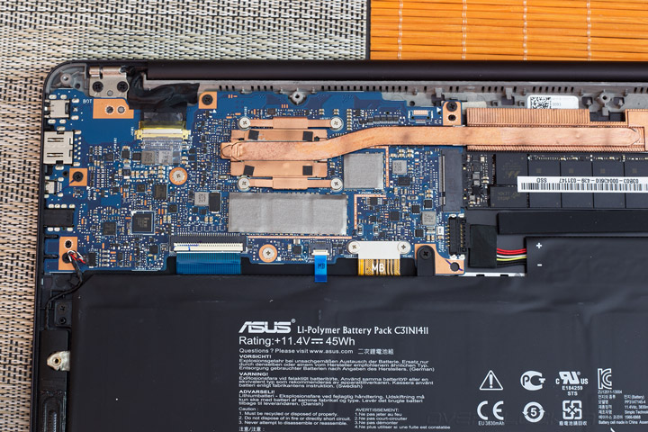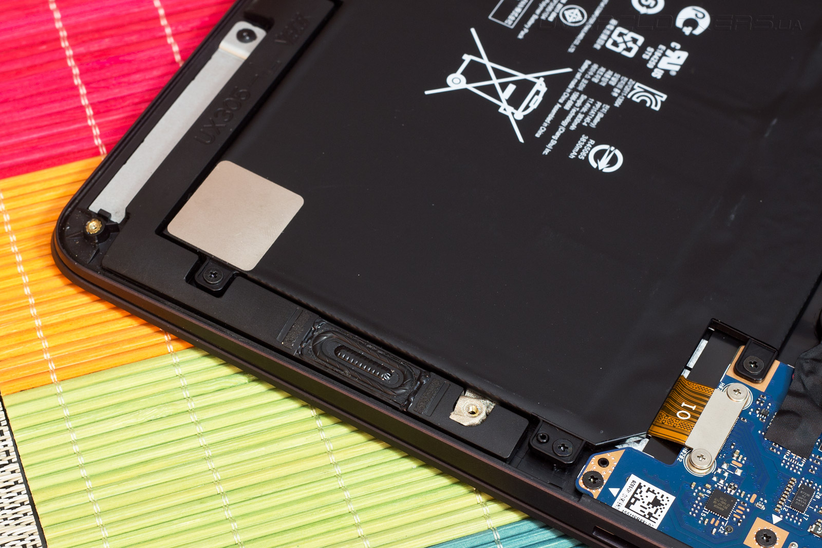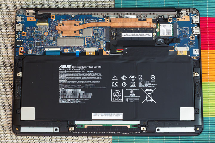 Первое, что бросается в глаза после демонтажа крышки — это небольшие габариты материнской платы, на которой удалось разместить все необходимые для работы компоненты. Большую часть внутреннего пространства выделено под литий-полимерную аккумуляторную батарею ёмкостью 3830 мА•ч. Ее запаса должно хватить для обеспечения до 10 часов автономной работы в режиме смешанной нагрузки.