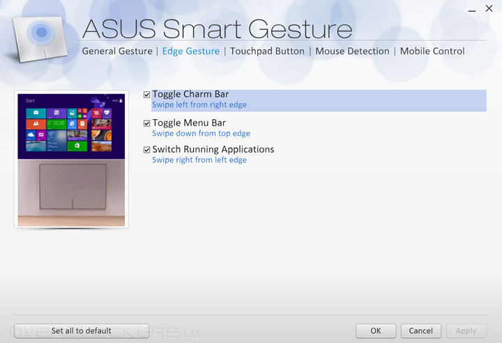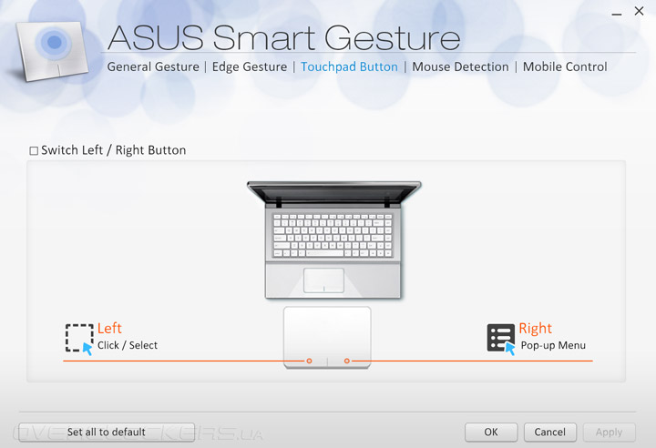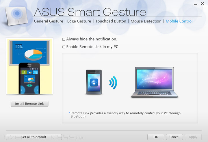 В комплекте со своим продуктом компания ASUS поставляет целый ряд фирменного программного обеспечения. Утилита ASUS Smart Gesture предназначена для тонкой настройки сенсорной панели лэптопа. Пользователь может активировать поддержку желаемых жестов, поменять местами правую и левую кнопки или назначить на них определенное действие. Есть и интересная функция контроля ПК при помощи смартфона с сенсорным экраном.