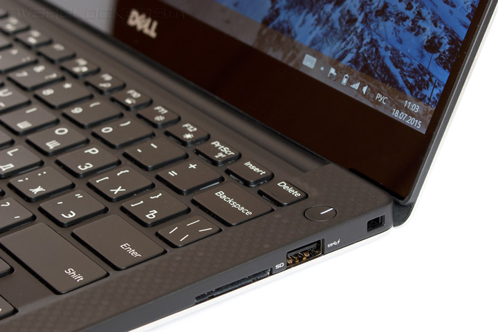 С правой стороны расположился еще один порт USB 3.0, SD-картридер и замок Kensington. Чуть выше можно увидеть кнопку включения-выключения ноутбука. На боковинах нашлось место и для двух стереодинамиков, суммарной мощностью в 2 Вт. Несмотря на свою миниатюрность, они обладают довольно большим запасом громкости, которого вполне хватит для комфортного просмотра фильма с расстояния в пару метров.