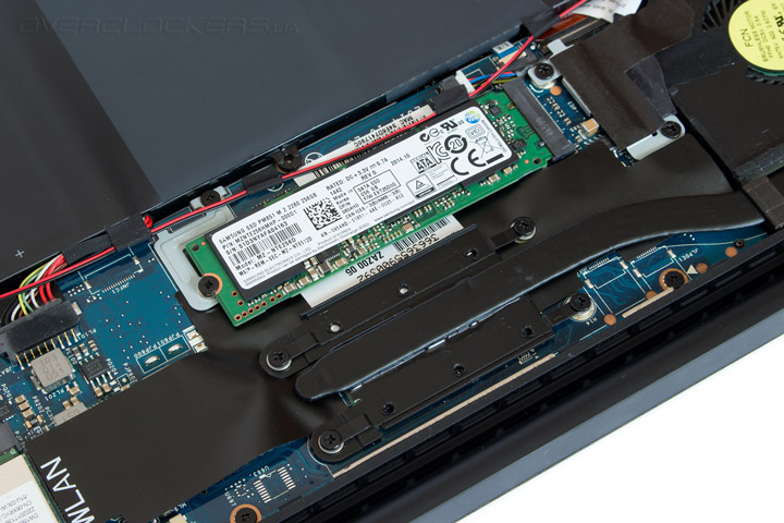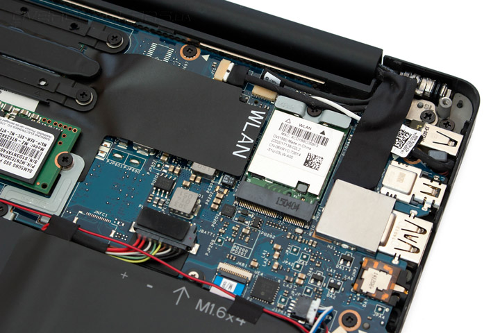 Хотя компоновка устройства и предусматривает быстрый доступ ко всем составляющим системы, возможность самостоятельной замены предусмотрена лишь для некоторых из них. Так при желании, пользователь сможет увеличить объем твердотельного накопителя (в нашем случае был установлен SSD Samsung PM851 на 256 ГБ) или переставить модуль беспроводной сети. Что же касается центрального процессора и оперативной памяти, то они идут изначально распаянными на материнской плате. Вины Dell в этом нет, ведь правила игры тут диктует корпорация Intel, поставляя свои мобильные CPU исключительно в компоновке BGA.