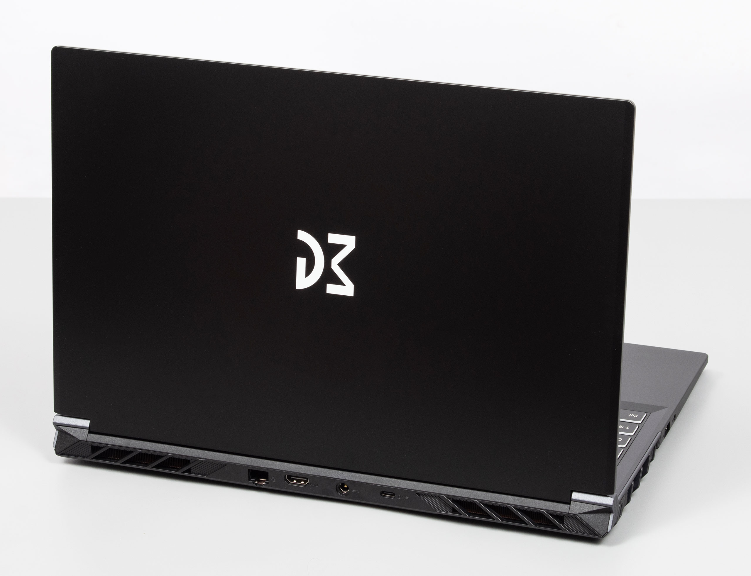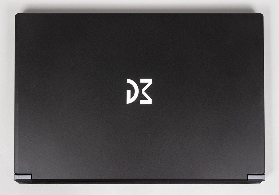 Лэптоп имеет размеры 361x248,5x24,9 мм при весе 2,25 кг — здесь ничего революционного вроде тонкого корпуса или уменьшенного веса, все стандартно. Верхняя крышка имеет фаски по бокам, что добавит комфорта при использовании, и логотип DM в центральной части.