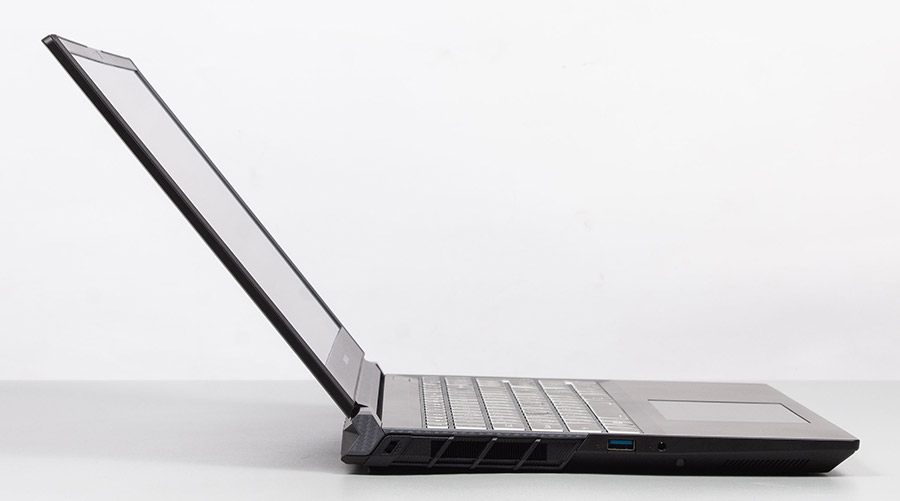 По бокам периферийных разъемов немного, только необходимые. Слева расположен порт USB 3.2 Gen1 Type-A и комбинированный аудио-разъем, а через брутальную решетку сопла выхода горячего воздуха можно увидеть прорезь для замка Kensington.